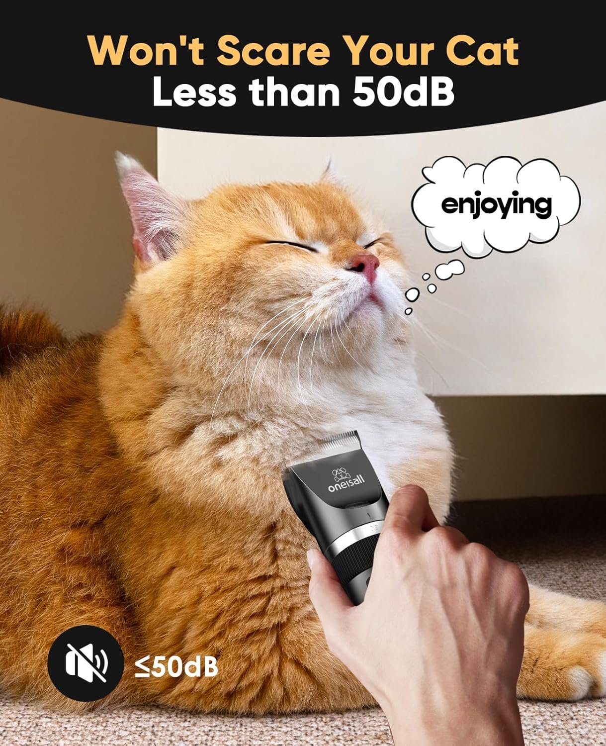 What You Get: Oneisall cat grooming clipper, 6 guide guards (3mm,6mm,9mm,12mm,15mm,18mm), cleaning brush, comb, scissor. Includes everything you need to trim your dog’s or cat’s hair.