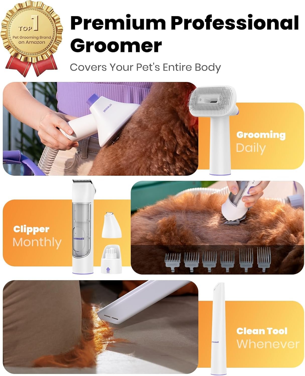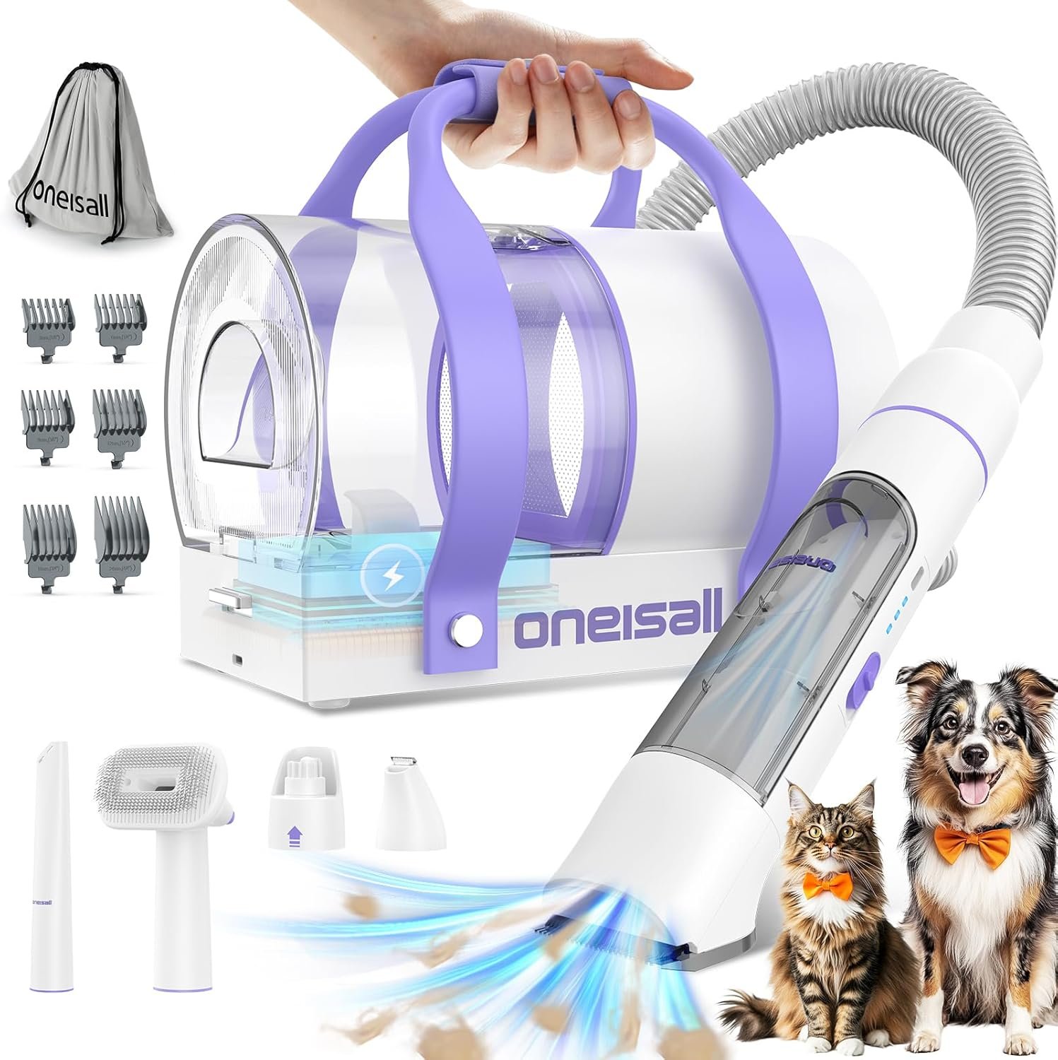 Professional-Quality Grooming at Home with 5-in-1 Kit. Our all-inclusive Pet Grooming Kit and vacuum is designed for both dogs and cats, ensuring a salon-like grooming experience for pets of all hair lengths. Bid farewell to costly salon visits and relish the convenience of grooming your furry friend within the cozy confines of your home, saving both time and money.