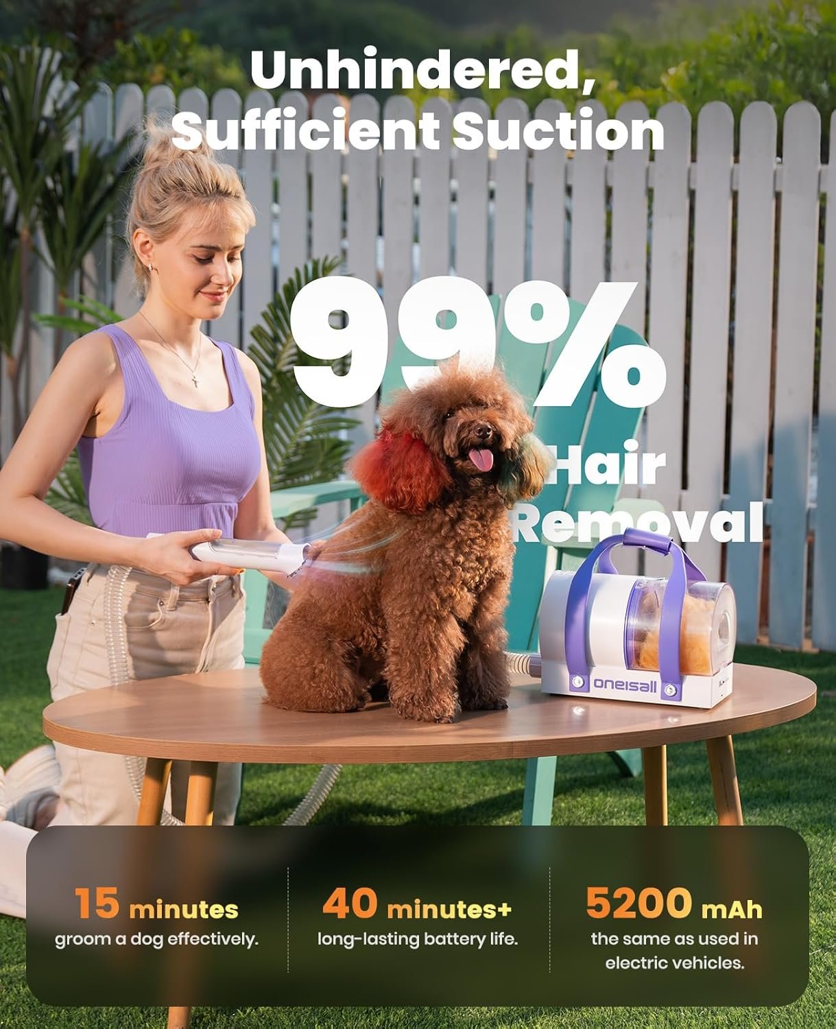 Rechargeable Battery, Low Noise, Cost-Efficient: The dog pet grooming vacuum comes with a 5200mAh rechargeable battery, offering up to 40 minutes of usage per charge. It operates in a whisper-quiet manner, reducing stress on pets, especially those sensitive to loud sounds. Consuming less power than conventional corded models, it’s an eco-friendly option for pet grooming.