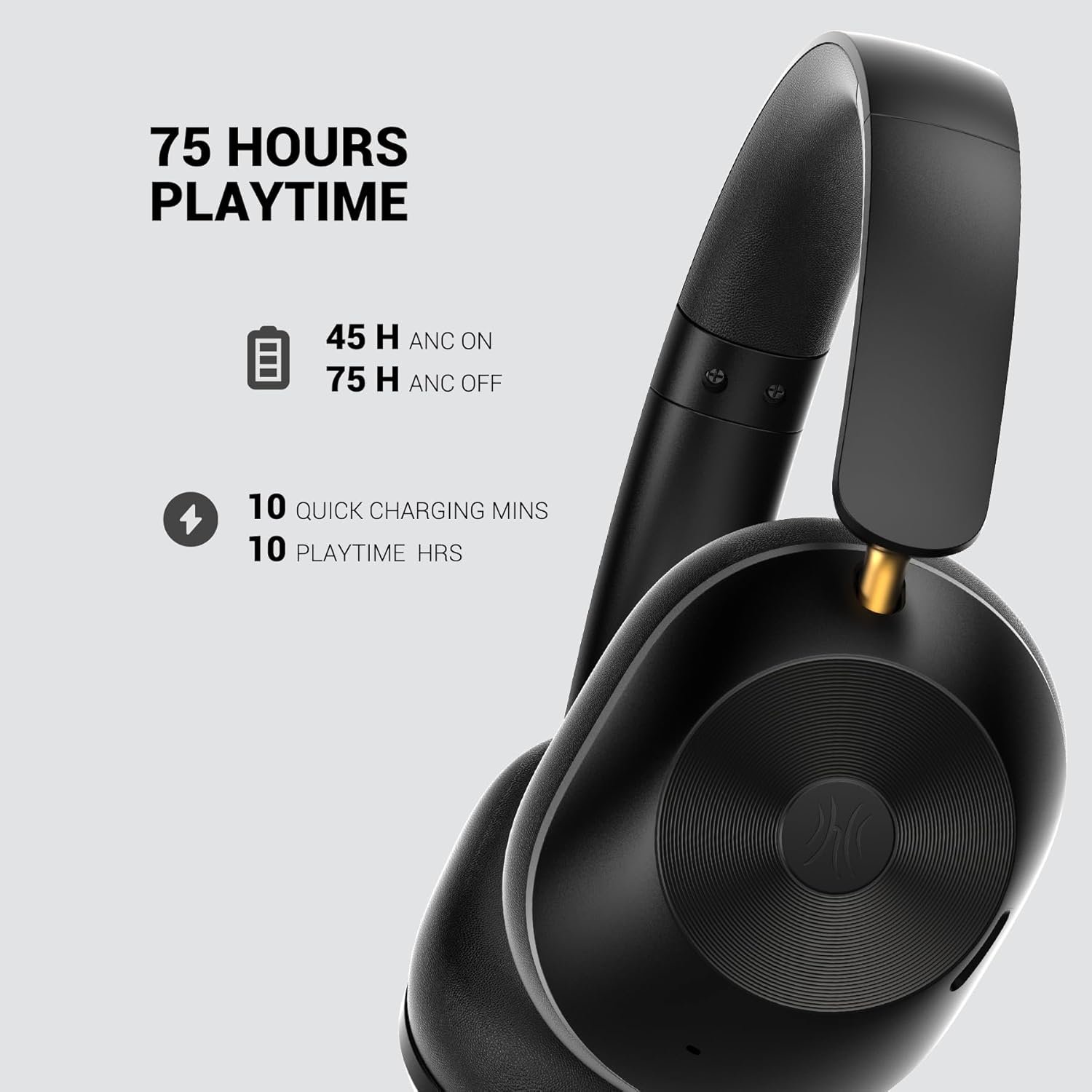 Noise Canceling Hybrid Active Noise Cancelling Battery Life Up to 75 Hrs, Quick charging: 10 Min charge for up to 10 Hrs playback Audio Features Lossless audio/LDAC for Hi-Res Wireless audio Calling Features Built in call noise cancelling microphone Connection Features Bluetooth 5.4 and Type-C audio cable (Type-C audio cable is not included in the package ) Special Features Supports noise reduction and lossless audio in wired mode (Type-C audio cable is not included in the package )