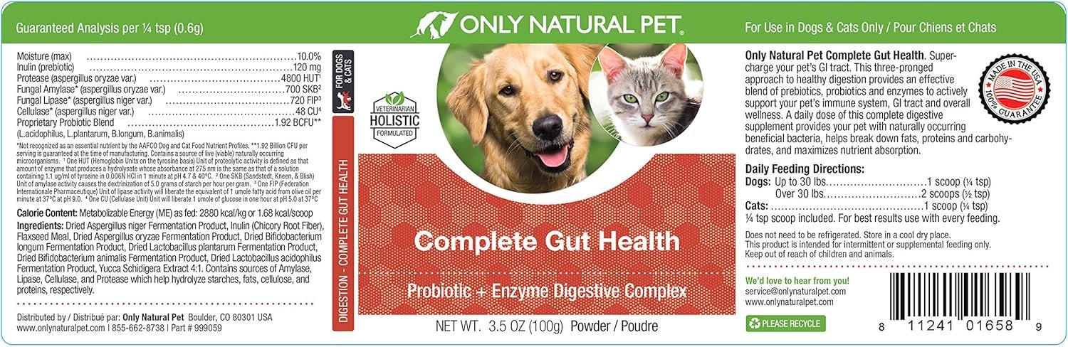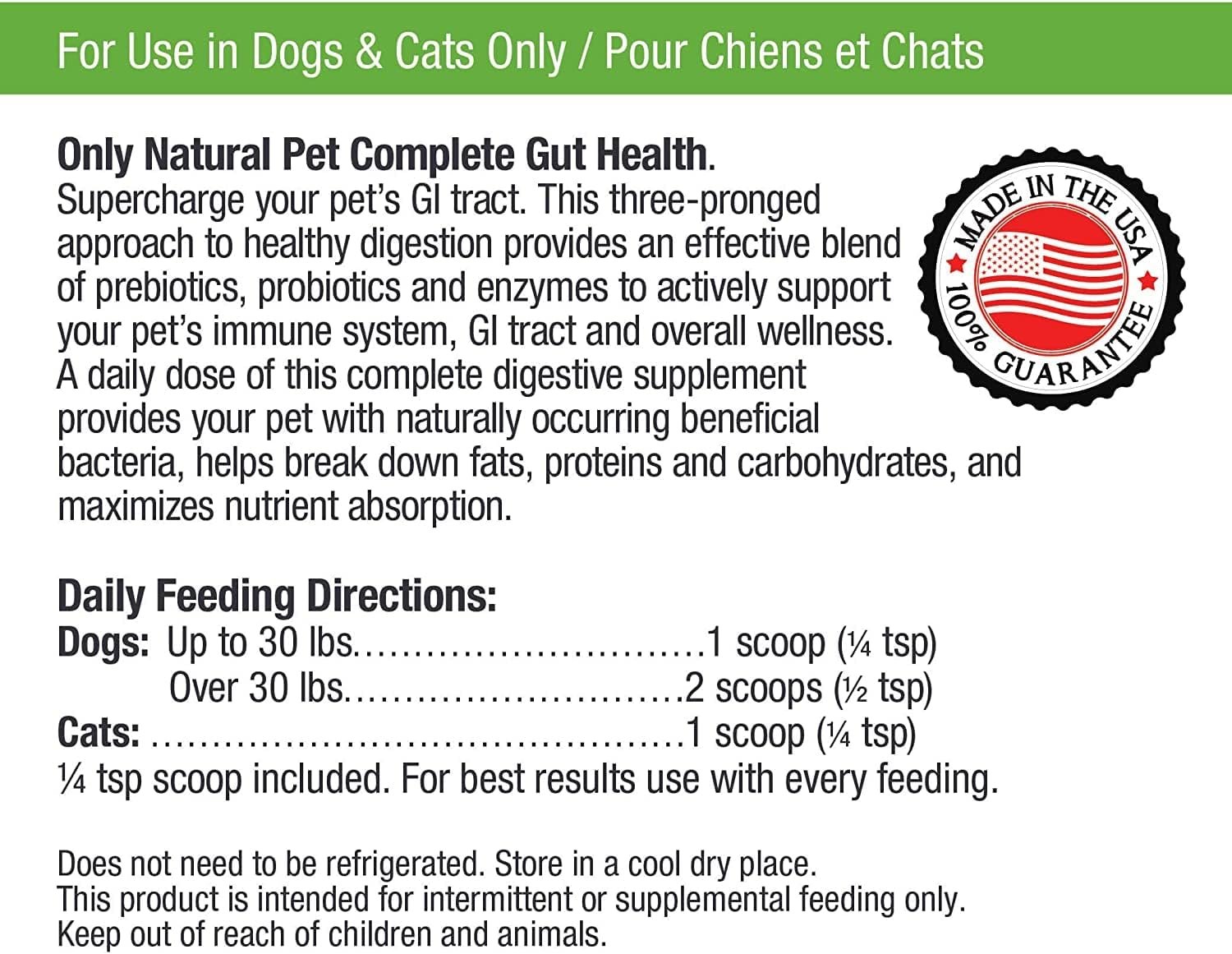 DIGESTIVE CARE FOR YOUR PET: Only Natural Pet Complete Gut Health Complex offers three components to care for your pet’s entire digestive system. It includes digestive enzymes, prebiotics, and probiotics to help break down fats, proteins, and carbohydrates, and to support healthy microflora.