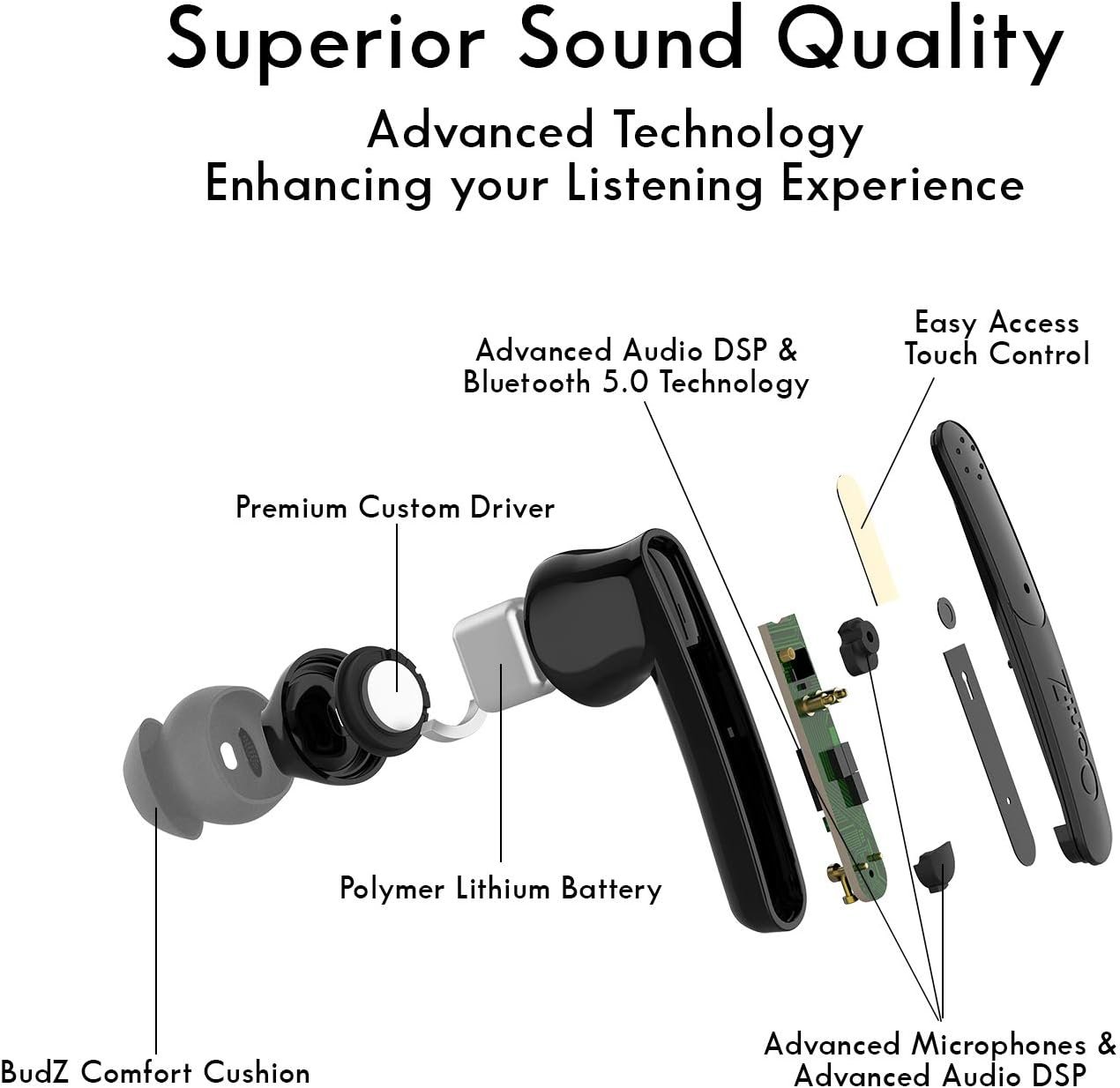 EARBUDS TWO LISTENING MODES: QUIET MODE – Active noise cancellation technology provide immersive sound by blocking out external noise and distractions around you, so you only hear your favorite music or movie in enhanced clarity. SOUND PASSTHROUGH MODE – Allows external sounds to pass through the BudZ to hear the world around you. No need to remove your BudZ, with a touch of a button you can hear the traffic around you, announcements on an airplane or order at your favorite coffee shop.