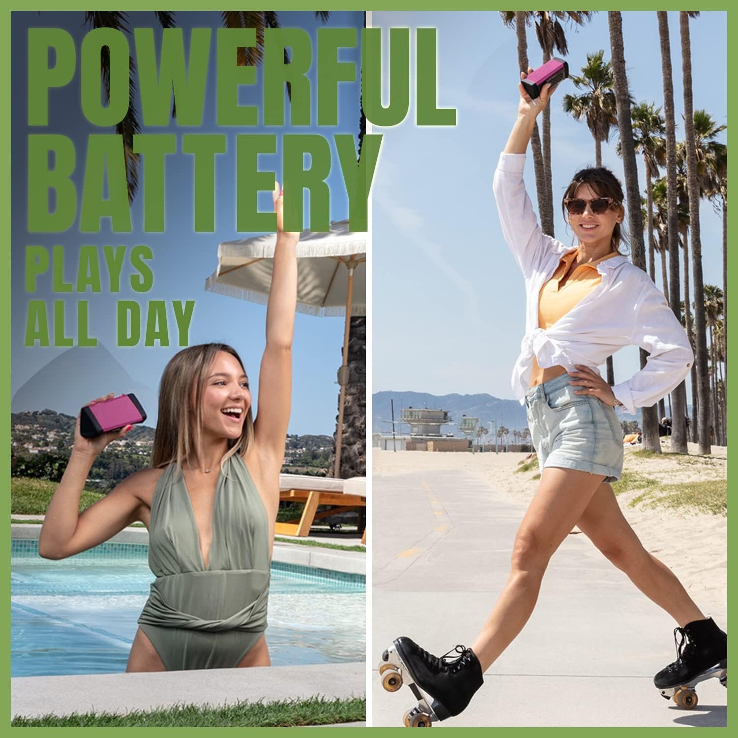 Small in size yet features 10 Watt superior distortion-free sound with rich full bass even at a max volume; With an incredible wireless 100 ft range to fill your home with high-quality sound! IPX5 is certified water-resistant, so you can listen to music in the shower, and safe to take to the beach, by the pool, in the backyard, picnics, outdoor gatherings, or parties. With an excellent battery performance of up to 14 hours of playtime on a full charge. Enjoy streaming your music on your device from morning till night!