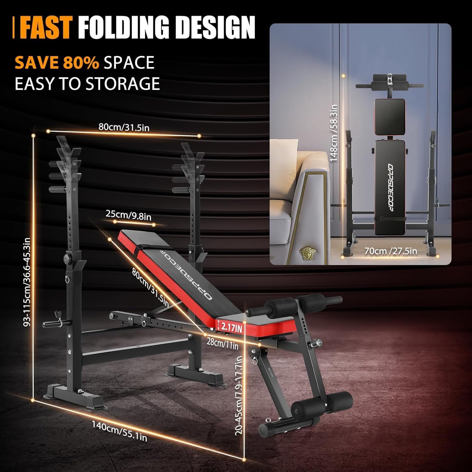 【80% Space-saving】This foldable bench press saves 80% of space when folded, easily fitting into corners without occupying your living space. Unfolded dimensions: 55.2″ X 31.5″W X 36.6-45.3″H. Folded dimensions: 31.5″L X 58.3″H.