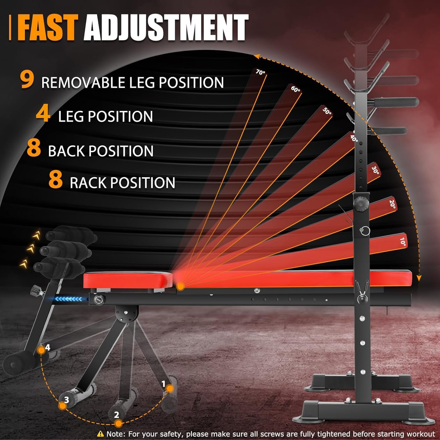 【Multi-angle Adjustment】The barbell rack of this weight bench has 8 adjustable levels, the backrest has 8 adjustments from 0° to 70°, the workout bench foot has 4 adjustments and can be turned into a decline workout bench with the detachable leg supports, and the detachable leg support has 9 adjustments, catering to people of different heights.