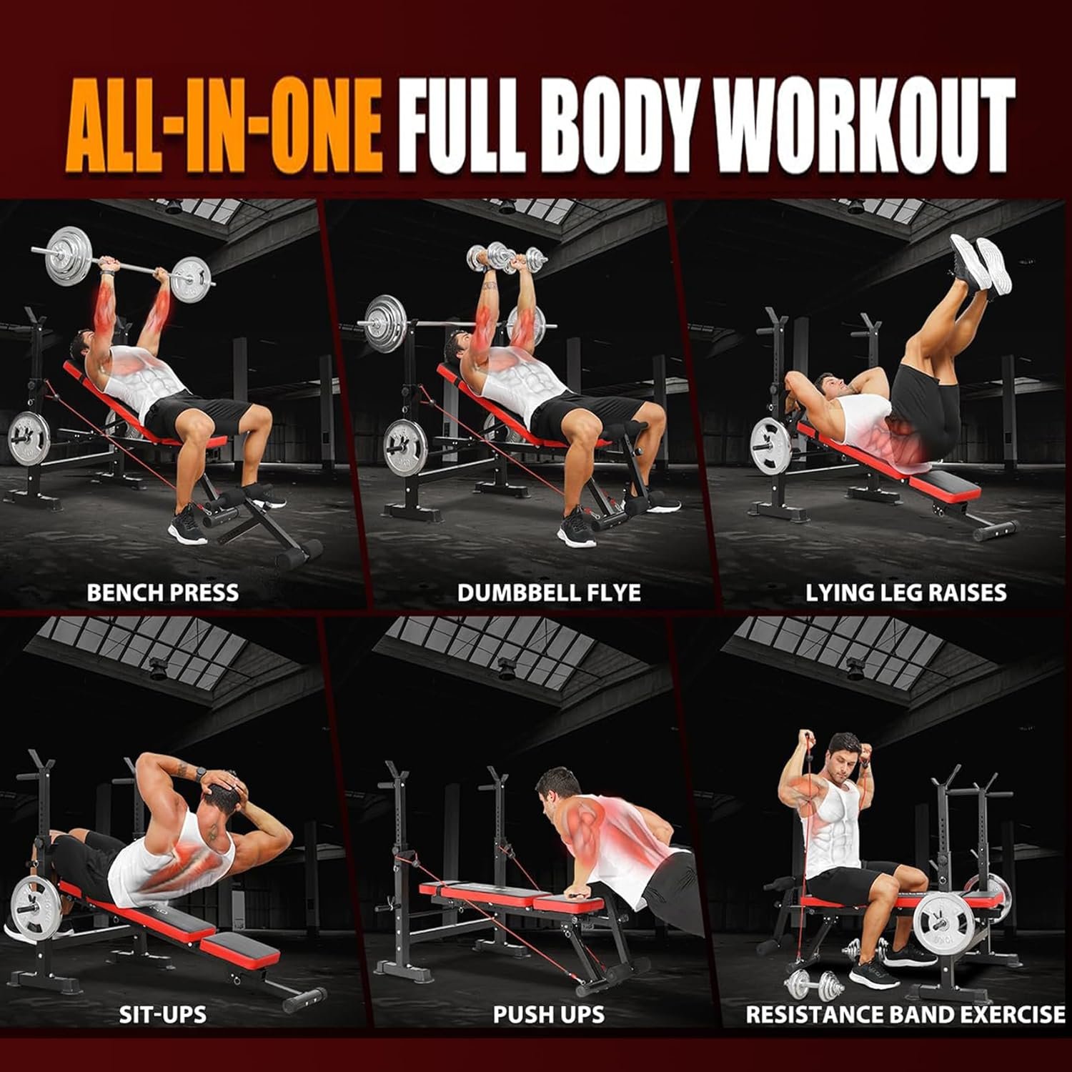 【660 lbs Weight Capacity】This bench press set made with a robust metal frame and triangular structure, it can support up to 660 pounds. The weight bench also features non-slip rubber base for stability and safety during workouts.