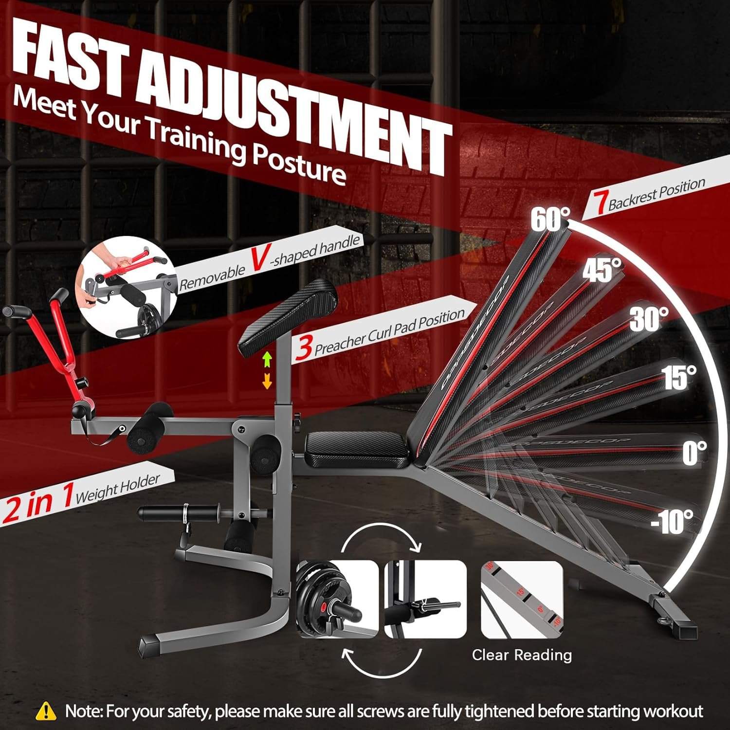 【Multi-Angle Adjustment】 The backrest is adjustable in 7 levels, with clearly marked degrees on the support bar for easy visibility. The preacher curl pad is adjustable in 3 levels to accommodate users of different heights.