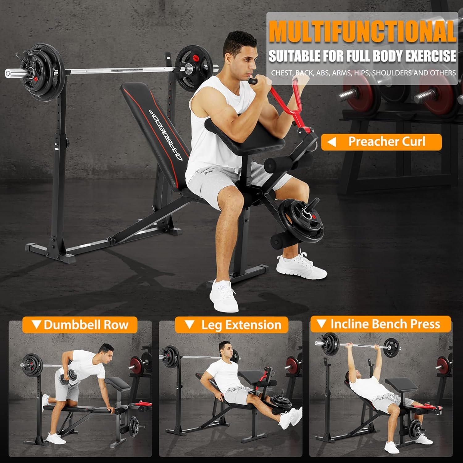 OPPSDECOR Adjustable Weight Bench Set with Leg Extension and Leg Curl, 900LBS Heavy Duty Profesional Bench Press Set with Squat Rack, Preacher Curl Strength Training Workout Benches for Home Gym