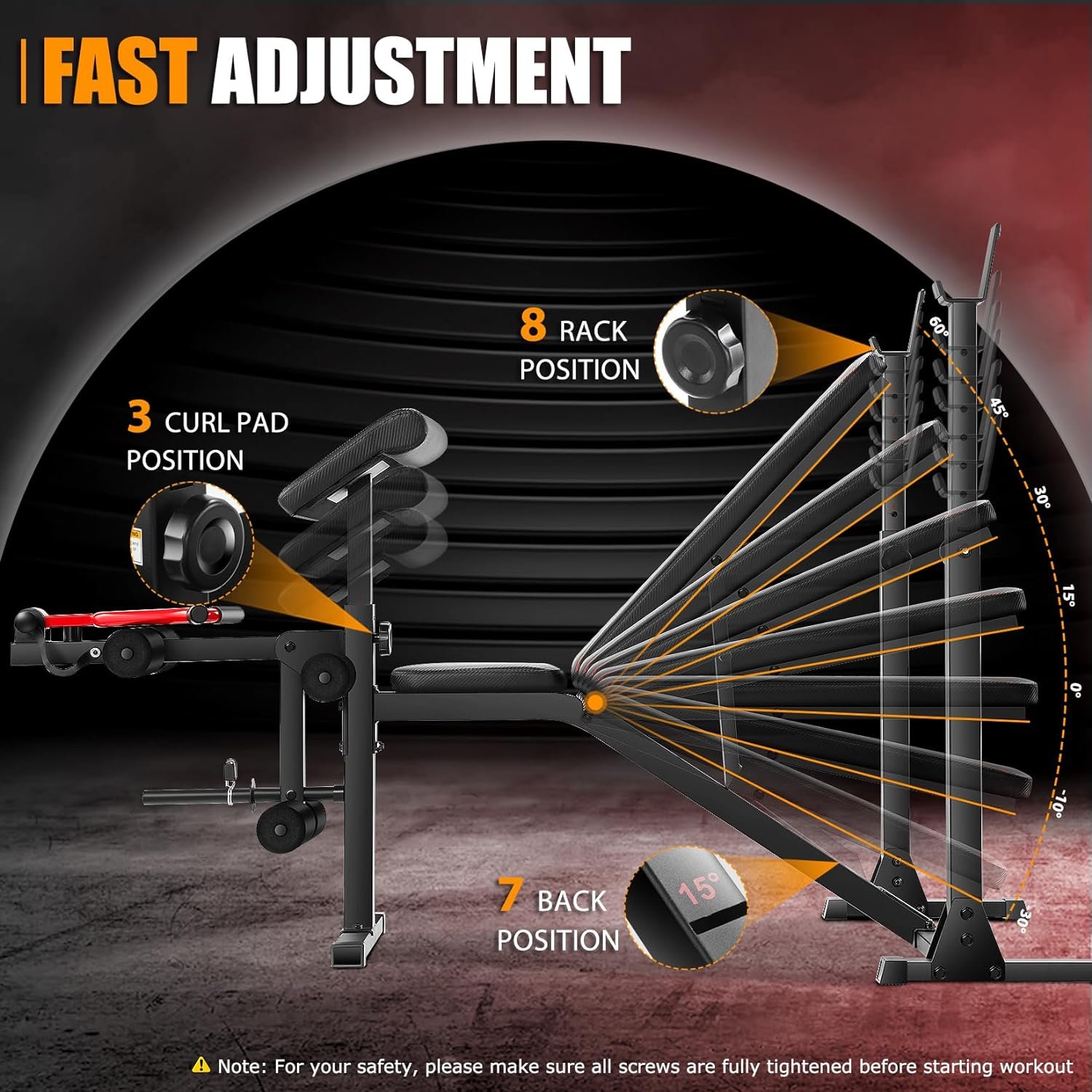 【Multi-position Adjustment】8 barbell rack position, 7 back pad position, preacher curl pad 3 position. No matter what size you are you’ll be able to find the perfect height for your workout with so many adjustable positions.
