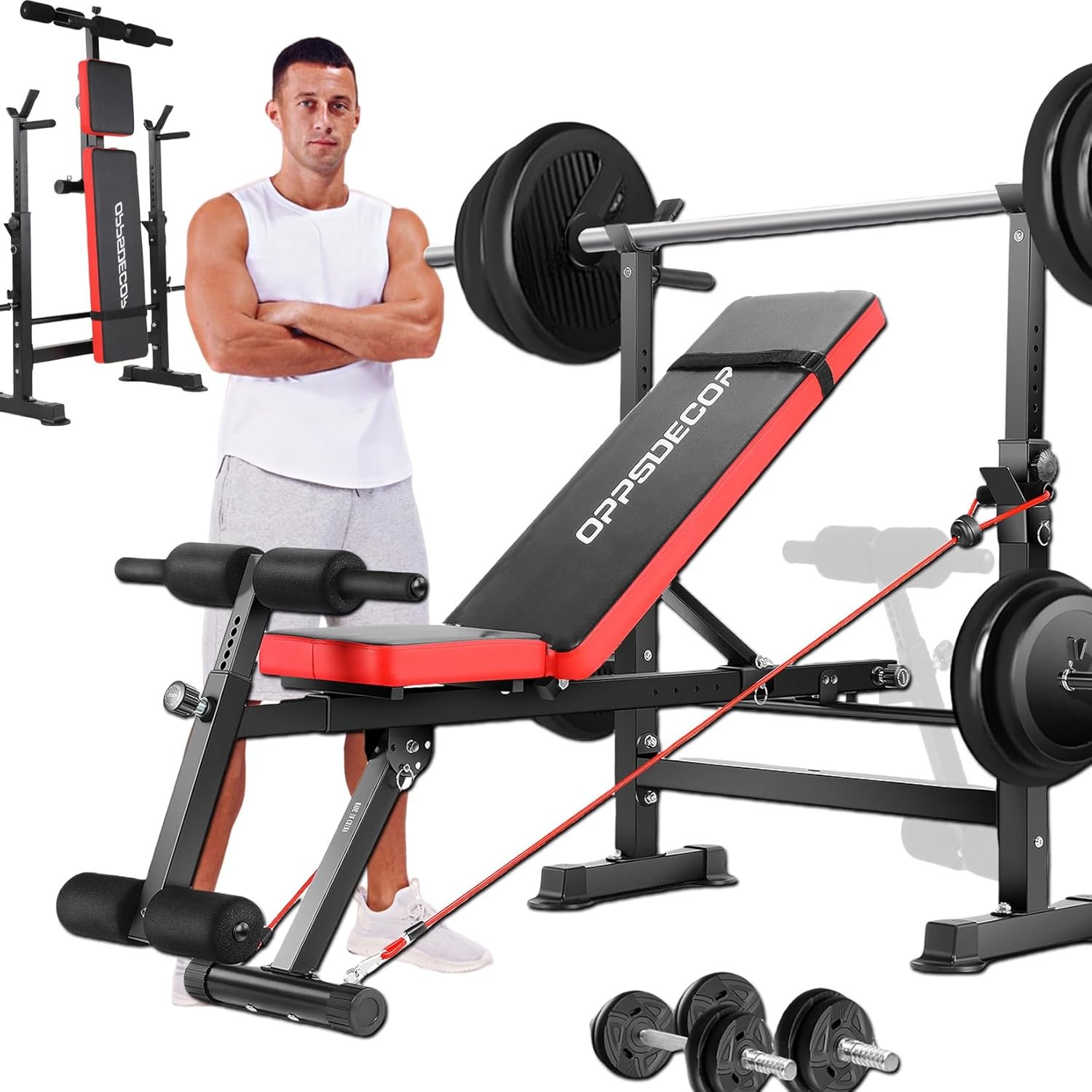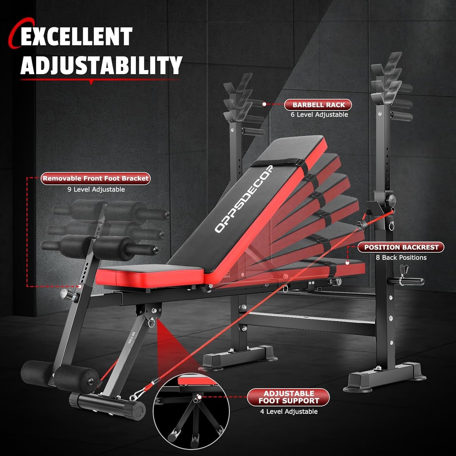 OPPSDECOR Adjustable Weight Bench Set with Squat Barbell Rack and Removable Foot Bracket, Bench Press Workout Bench with Weight Storage Sit up Incline Flat Decline 600lbs 6 in 1 Weight Bench for Full Body Exercise Home Gym