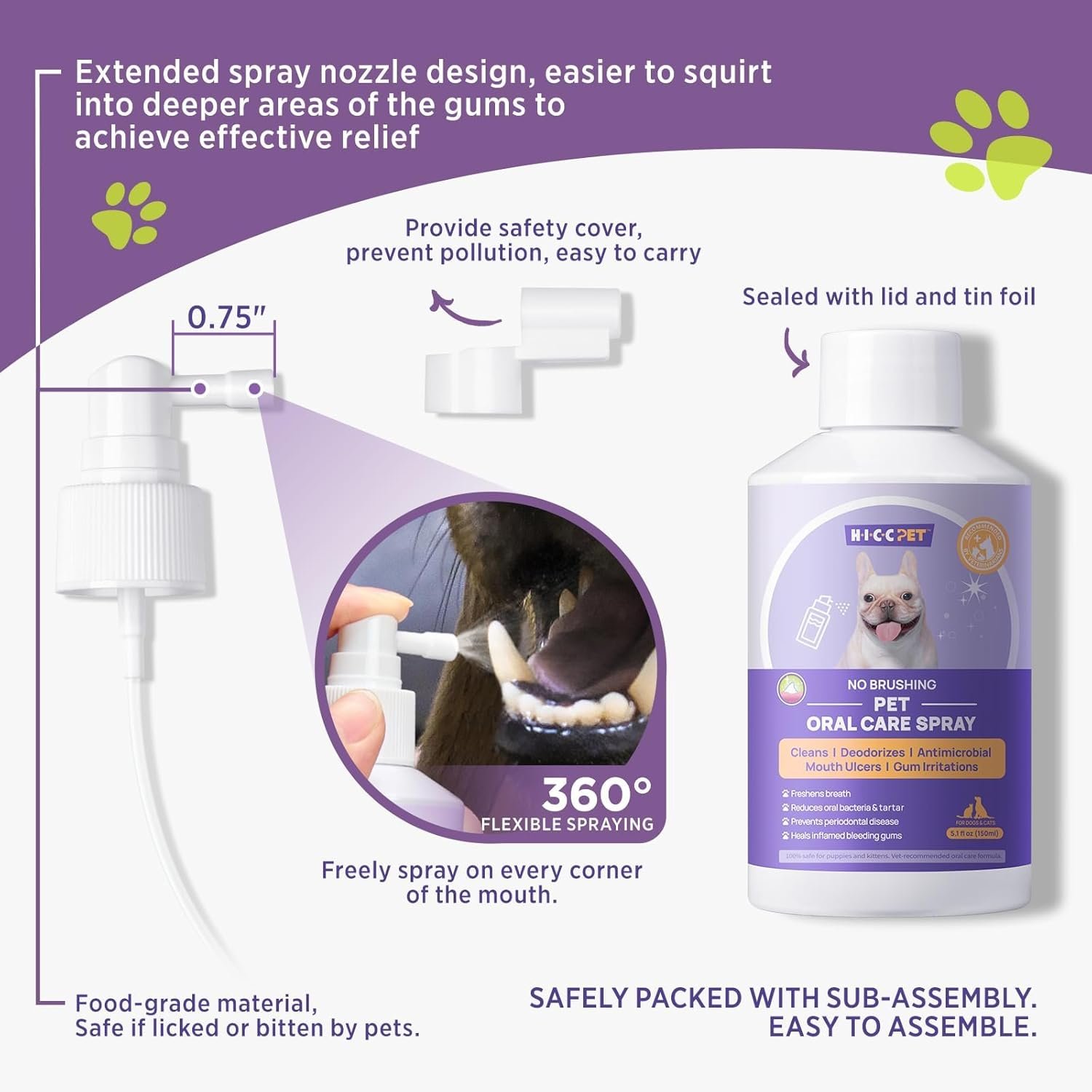 Pet Oral Care Spray. Our pet breath spray has an extended nozzle unlike others, which can squirt into the deep gums to anti-inflammatory and remove bad breath. Bad breath treatment for dogs and cats. Making a pleasant experience for you and your pets.