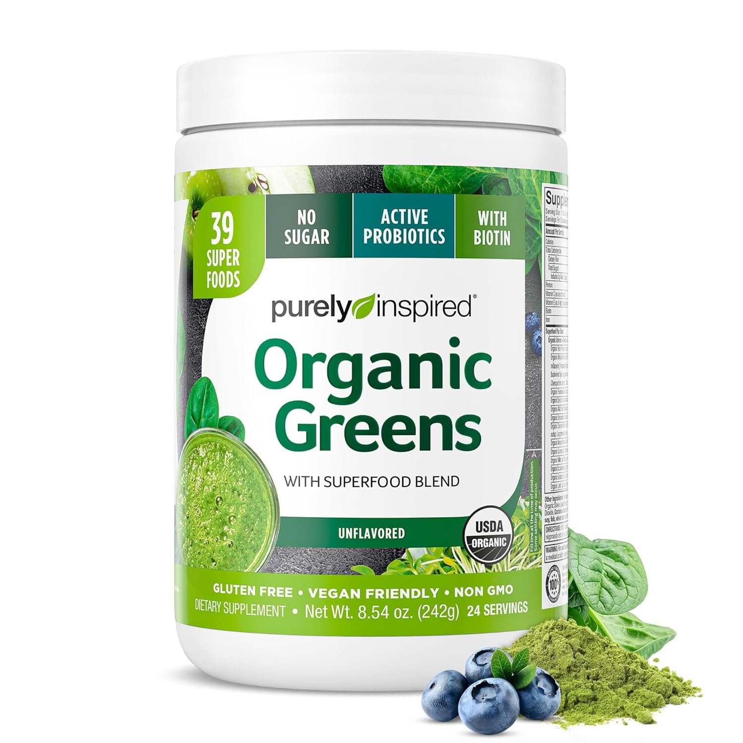 This bundle combines two organic green superfood powders to provide comprehensive daily nutrition. The Orgain Organic Greens Powder has 50 superfoods including organic fruits, veggies, ancient grains and greens like kale and spinach per serving. It also contains 1 billion probiotics to support digestive health. The greens come in a 0.62lb container. The Purely Inspired Organic Greens Powder provides 39 superfoods like spirulina and chlorella per serving along with 18 vitamins and minerals and 110 million CFU probiotics. It comes in an unflavored formula with 24 servings per container. Both organic powders are USDA certified and contain no artificial flavors, colors or sweeteners. They are non-GMO, gluten-free and vegan friendly. This bundle offers the combined nutritional benefits of 89 different superfood ingredients. With antioxidants, fiber and probiotics, these powders aim to boost nutrition, gut health and overall wellbeing. They can be blended into smoothies or shaken with water or non-dairy milk for on-the-go plant-based nourishment.
