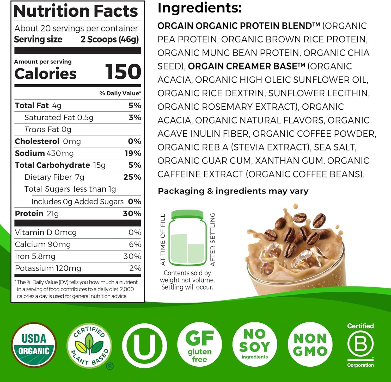 WHAT TO EXPECT: Includes 1 (2.03 Lb) (20 Servings) ready to mix Orgain Organic Iced Coffee Protein Powder. Each serving contains 170 Calories (2 Scoops).
