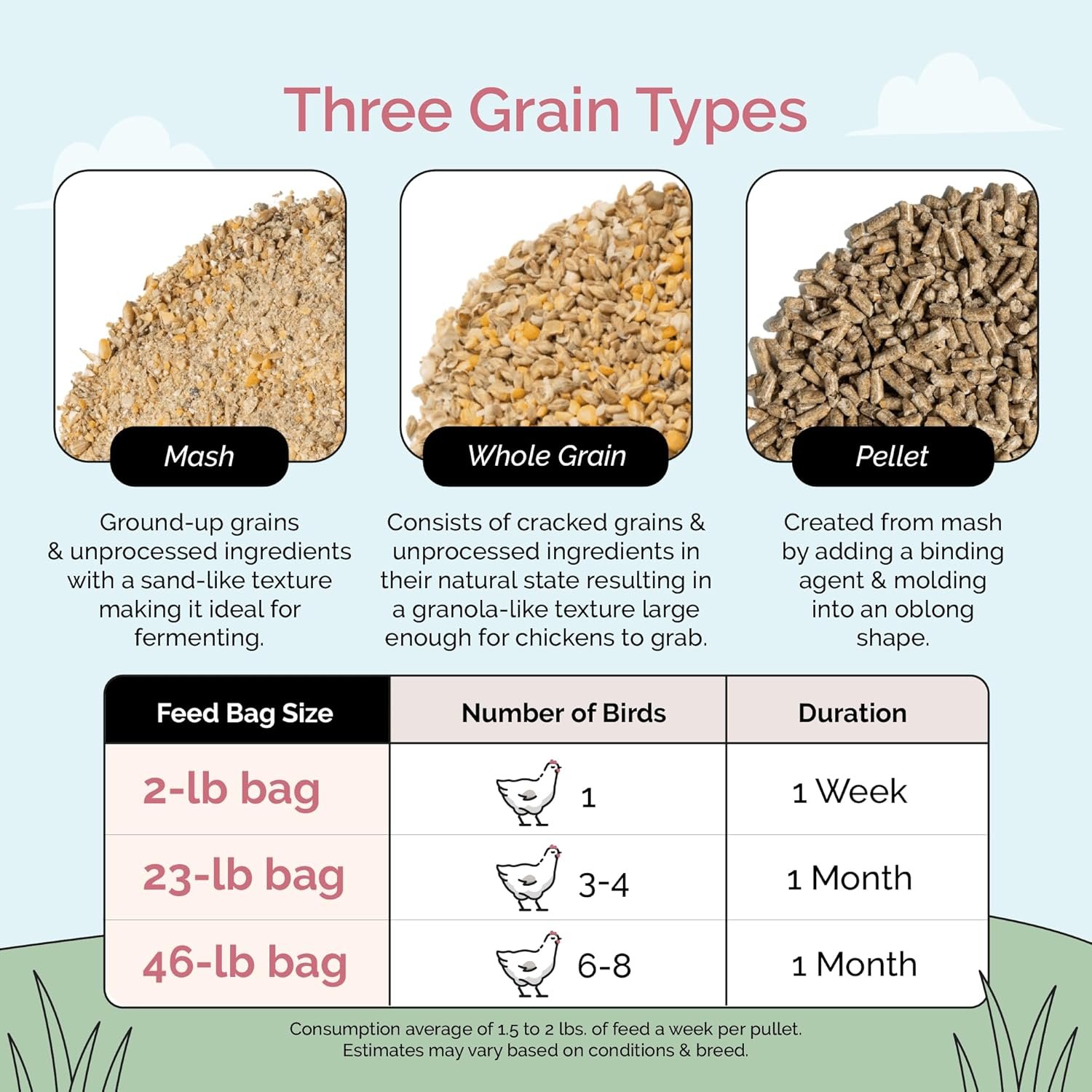 1 GROWER CHICKEN = 8 lb. PER MONTH: Grower chicken feed, 18% protein, is best at 8-20 weeks. Grower chickens eat 8 lbs. per month & one 2 lb. bag will feed 1 grower chickens for 1 week