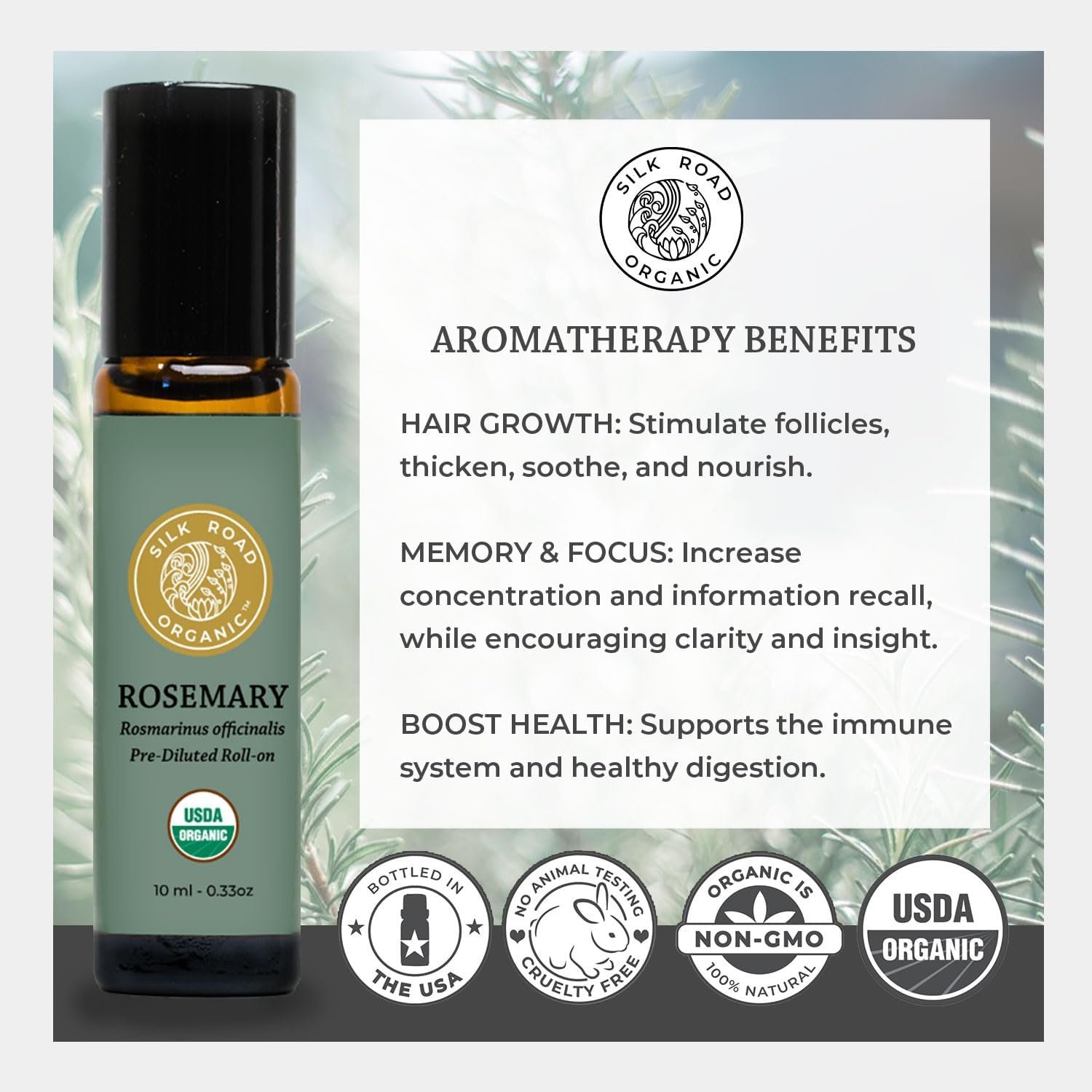 100% PURE, NATURAL, NON-GMO USDA Certified Organic essential oil roll-on. Use to improve memory, soothe digestive problems, boost the immune system, and support hair growth. Worn by Greek scholars to enhance focus and concentration when taking exams, the memory strengthening ability of rosemary has been known for thousands of years.