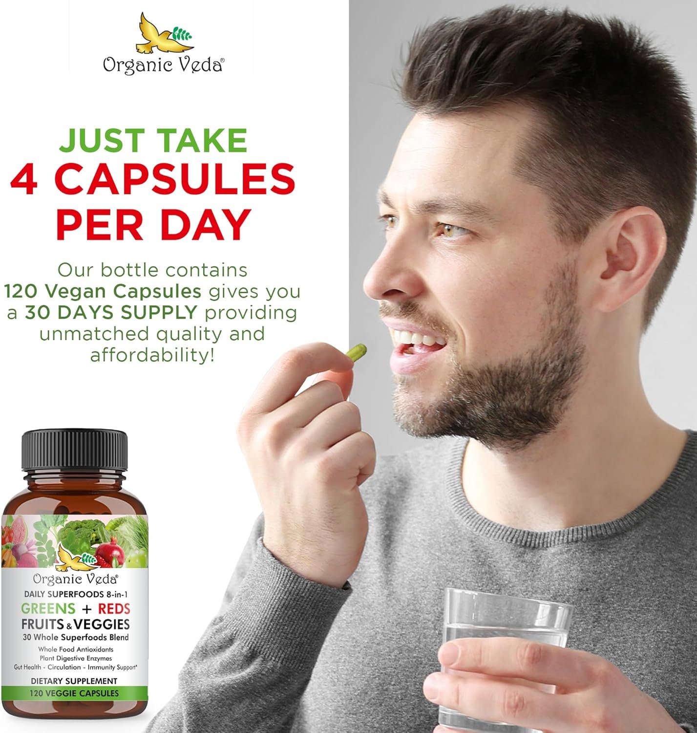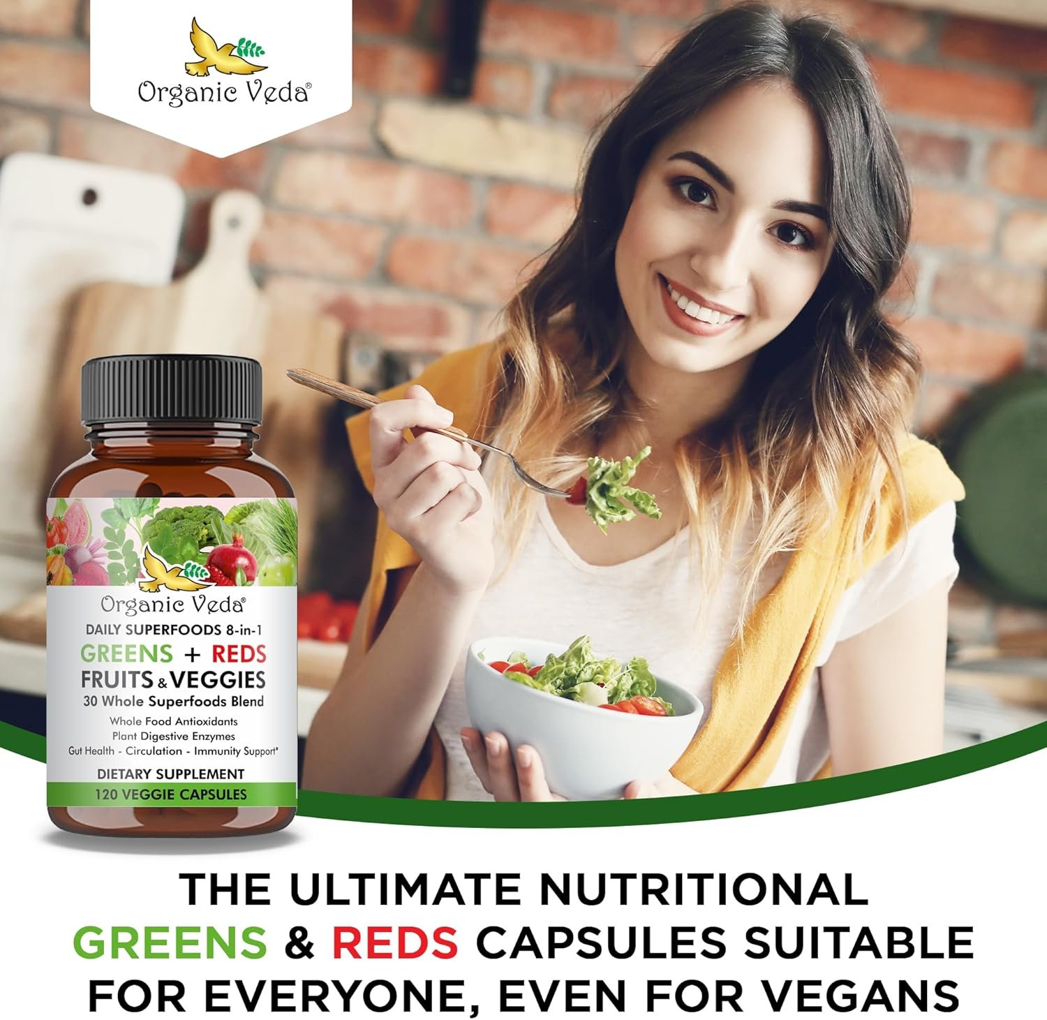 Power of Green Superfood Powder: These vegan reds and greens capsules harness organic greens (wheatgrass, barley grass, broccoli, celery, cabbage, spinach leaf, moringa leaf, alfalfa) for a nutrient boost. The ultimate nutritional greens & reds capsules suitable for everyone, even for vegans