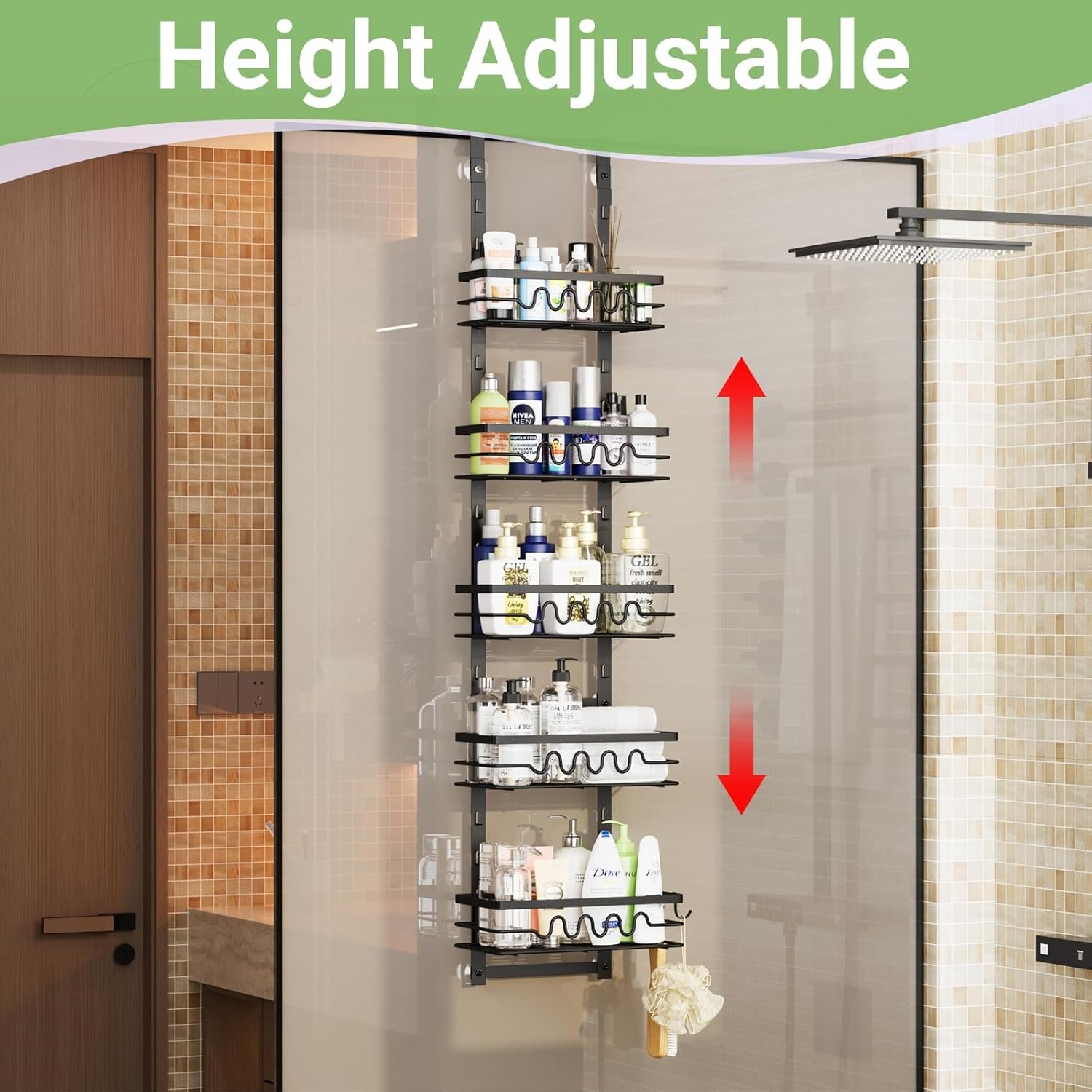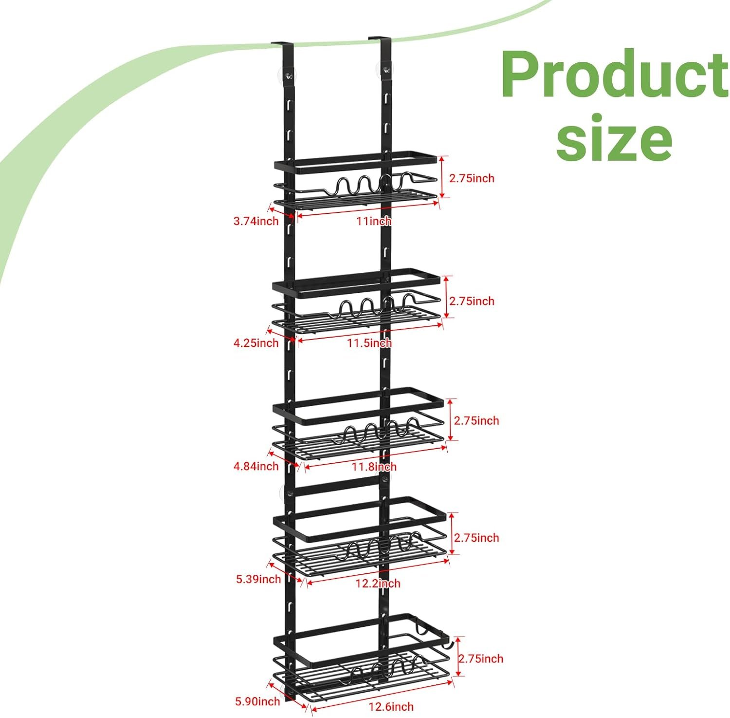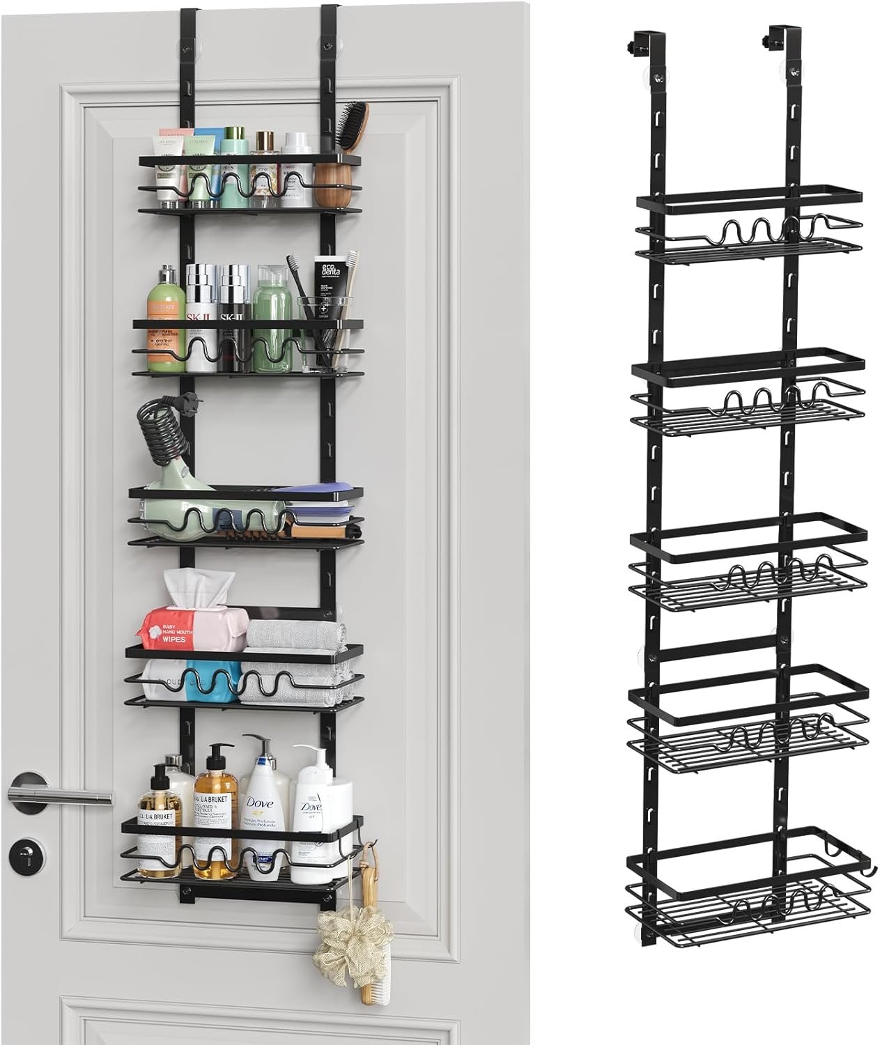 【Adjustable Design】This 5-tier over the door bathroom organizer is adjustable design, baskets can be reasonable combined according to storage needs. Storage of different heights by adjusting the spacing between baskets, meeting your bathroom storage needs.