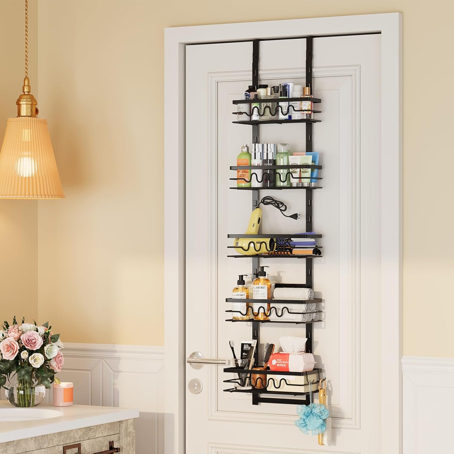 【Bathroom Storage Design】Our 5-tier heavy-duty bathroom door organizer adopts a lock design, the basket will not fall off easily, 5 basket sizes, convenient for storing various bathroom supplies, and is also equipped with two detachable hooks, Perfect for bathroom door organizer and storage.