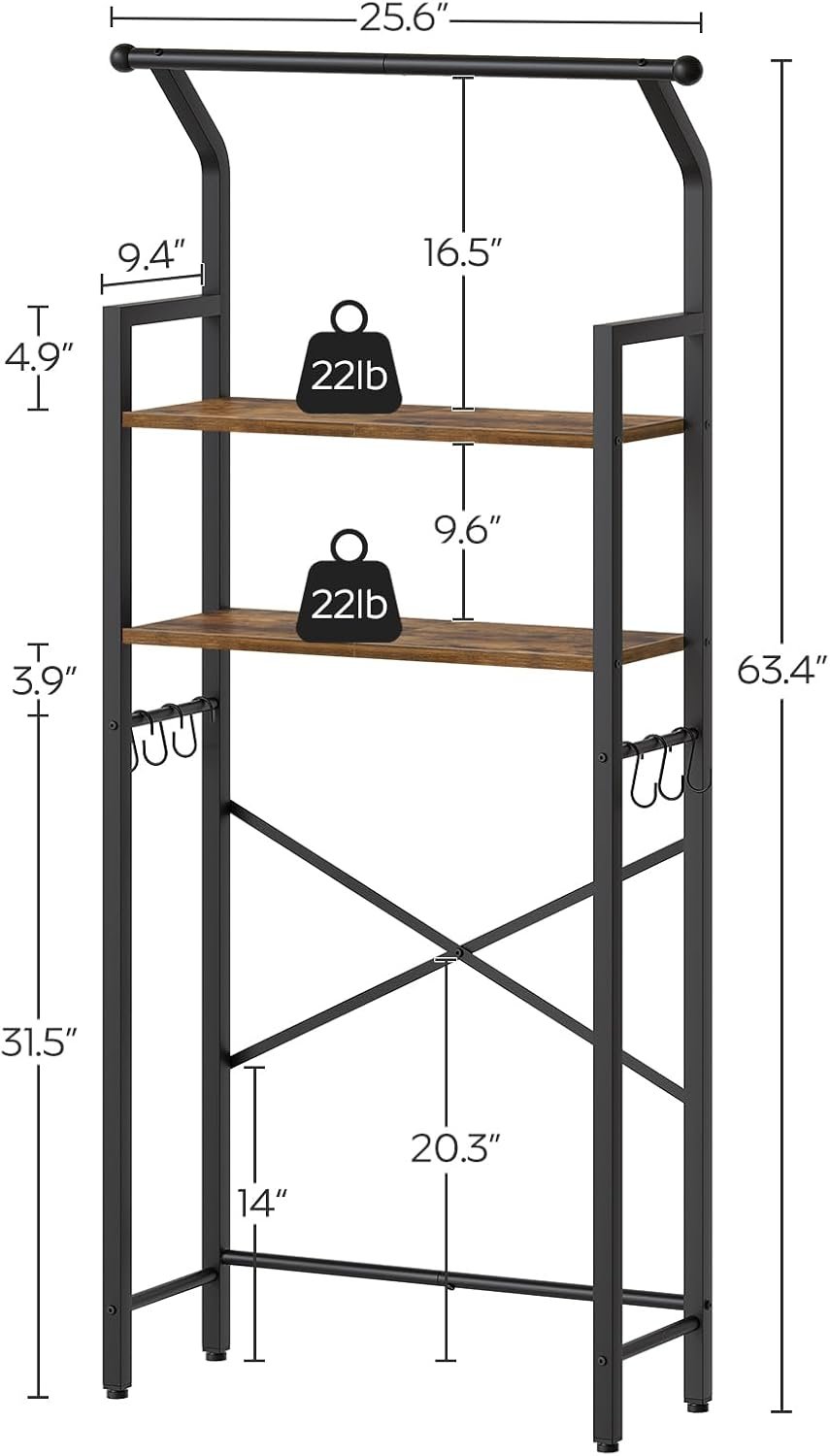 Sturdy and Secure: The over the toilet storage made of durable particleboard and a solid metal frame, the toilet shelf is built to last with a X-shaped back for added stability, rated at 22 lb. The adjustable feet level the shelf on various floors and the anti-tip kit doubles the safety