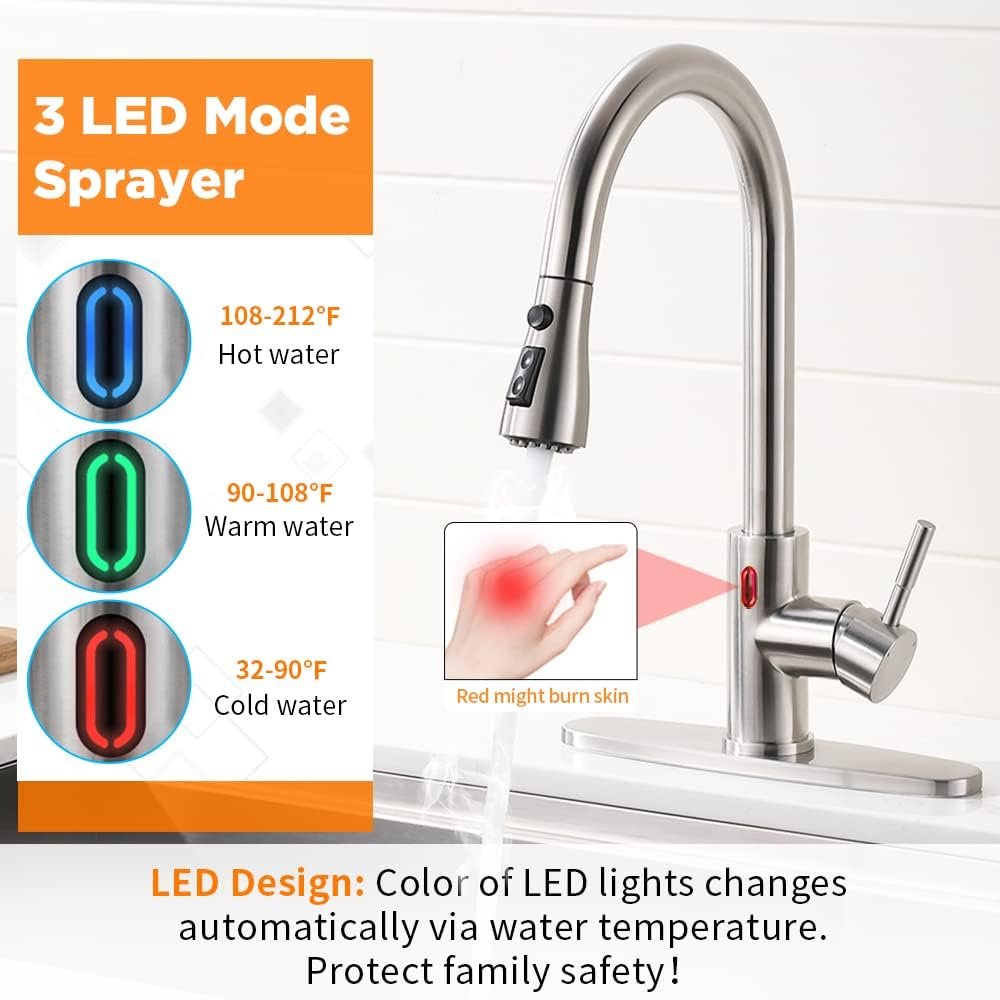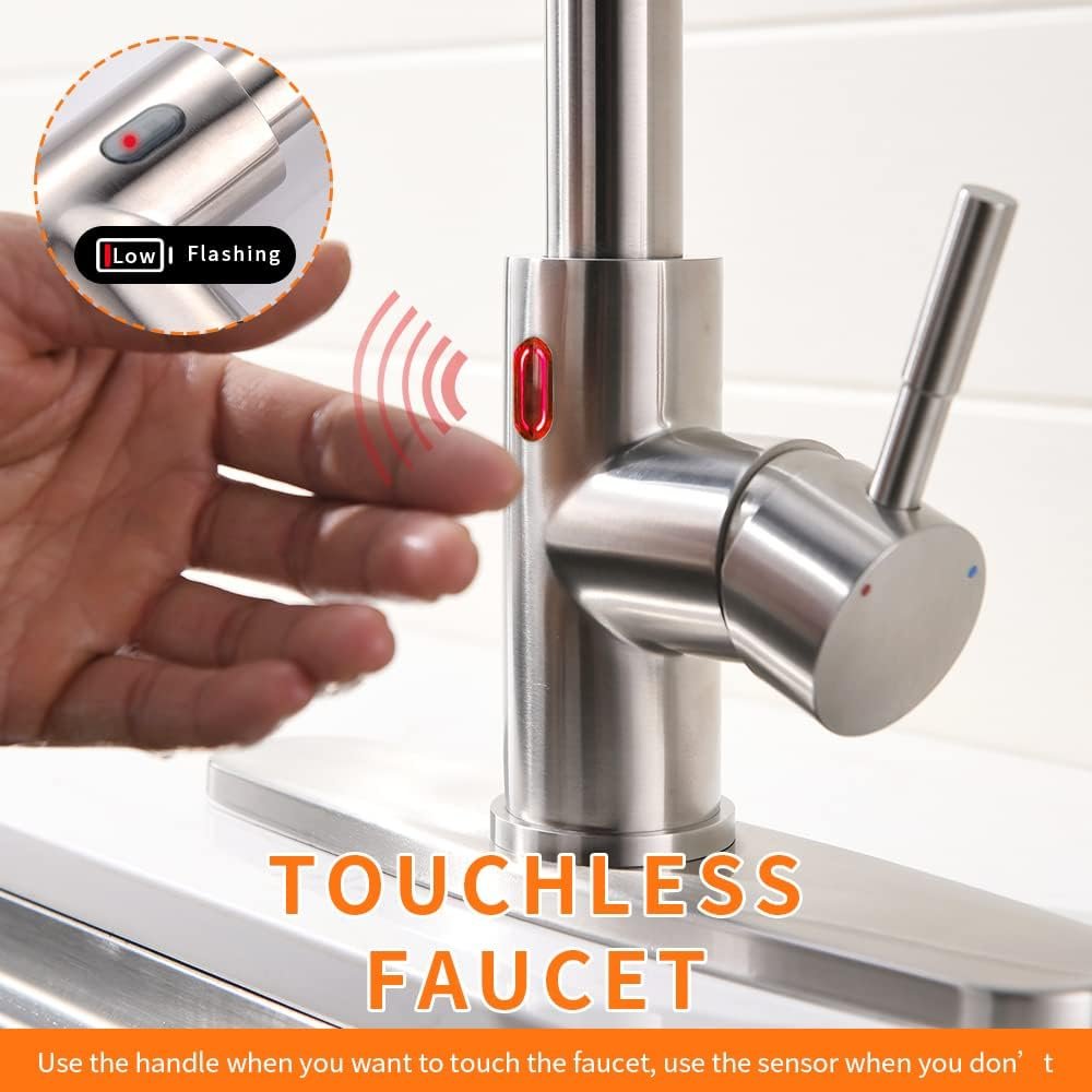 Motion Activated Kitchen Faucet: Put your hand near the motion sensor to activate the water flow. Put your hand again to turn the water off. Water will automatically stop after 3 minutes if no motion is detected, reducing excess water use. Hands-free kitchen faucet, more convenience and hygiene.