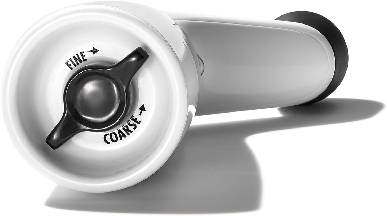 With its long turning arm and comfortable, non-slip handle, the Pepper Mill takes the labor out of grinding. The ceramic grinding mechanism adjusts from fine to coarse. A clear door opens wide for easy refilling, and the base keeps countertops clean.