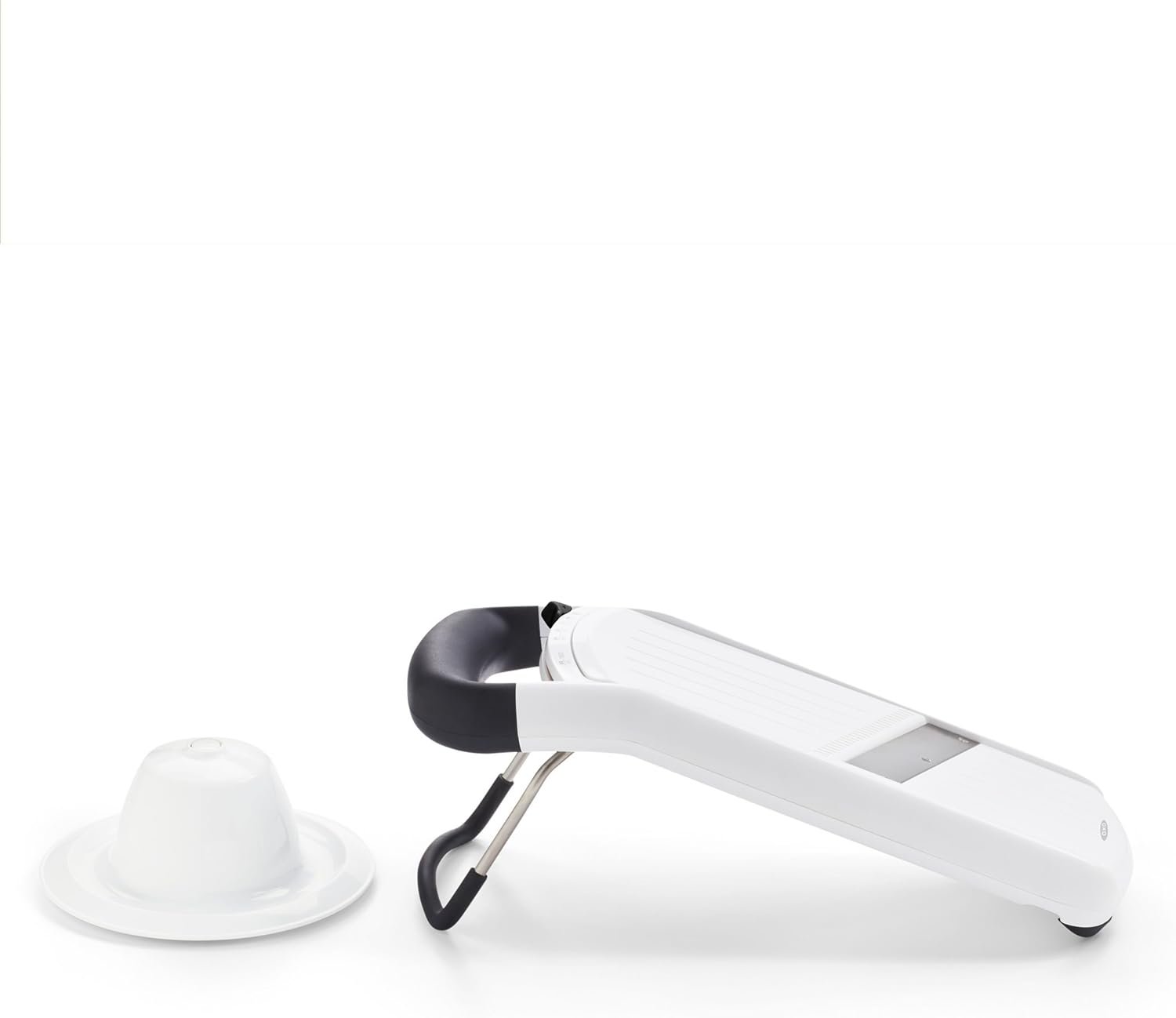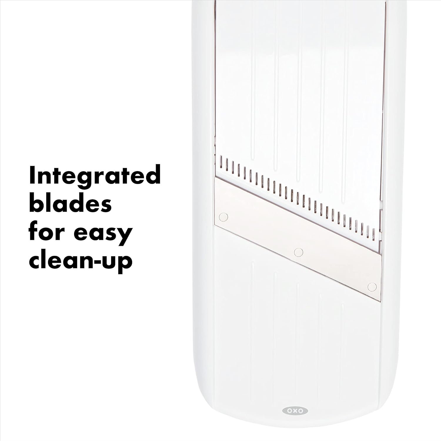 The OXO Good Grips Simple Mandoline Slicer is a staple for any kitchen. The tab slides to easily adjust between three slice thickness settings, julienne setting and storage setting. The angled stainless steel blade slices even soft foods with ease and the textured runway ensures that no food gets stuck while you’re slicing. The soft handle provides a soft, comfortable grip and the non-slip feet keep the Simple Mandoline Slicer steady while in use. The spring-loaded food holder pushes food for even slicing with little to no waste and has a generous rim to protect your fingers. When you’re done, there are no loose blades to clean or organize; the integrated blades are easy to clean. The legs fold in and the food holder nests on the upside-down Mandoline for convenient, compact storage. Check out the OXO Good Grips YouTube channel for tips and techniques.