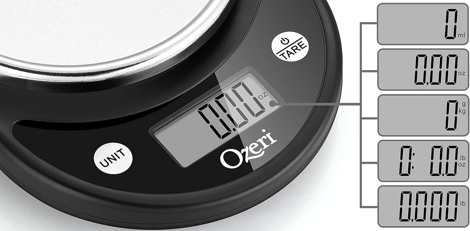 The new Pronto Digital Kitchen Scale by Ozeri is an uncompromising multifunction scale for the kitchen and home. The Pronto is built with the latest generation in sensor technology to ensure an accurate response for the fast-paced chef and features a newly enlarged weighing platform to accommodate larger bowls and food items. Elegantly designed with a refined finish, the Pronto also doubles as a postage machine for your mail or a scale for your children’s science projects. The Pronto’s large Unit button lets you change the unit of measurement with push-button ease, with 6 different units to choose from (g, lbs, lbs:oz, oz, ml, kg). The widescreen LCD displays provides wide viewing angle for the fast-moving chef. Manufactured to rigorous quality specifications, the Pronto weighs up to 11.24 pounds (5100 grams) in graduations of just 0.04 ounces (1 gram) to help you achieve your diet and weight goals. The Pronto also features a Tare button which automatically subtracts the weight of any bowl or container to calculate the net weight of your ingredients. The Pronto’s buttons provide an audible and tactile click confirmation, and runs on 2 AAA batteries (included), with a 2-minute automatic power-off to preserve battery life.
