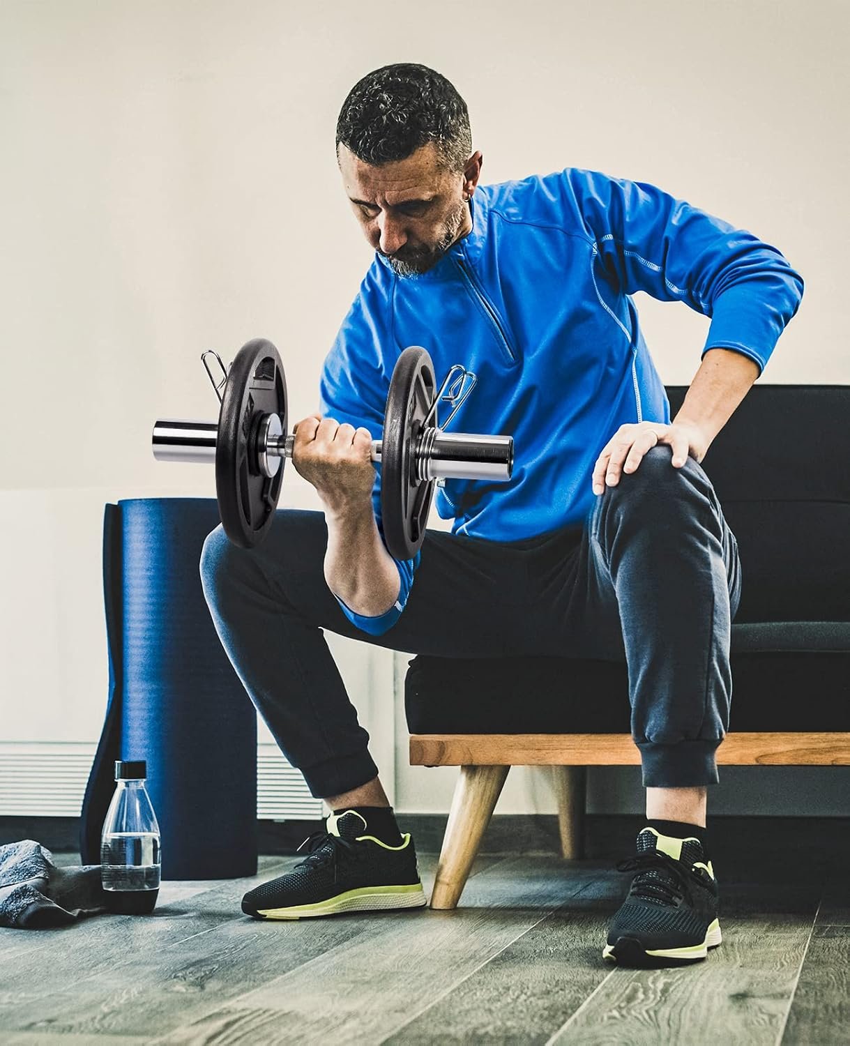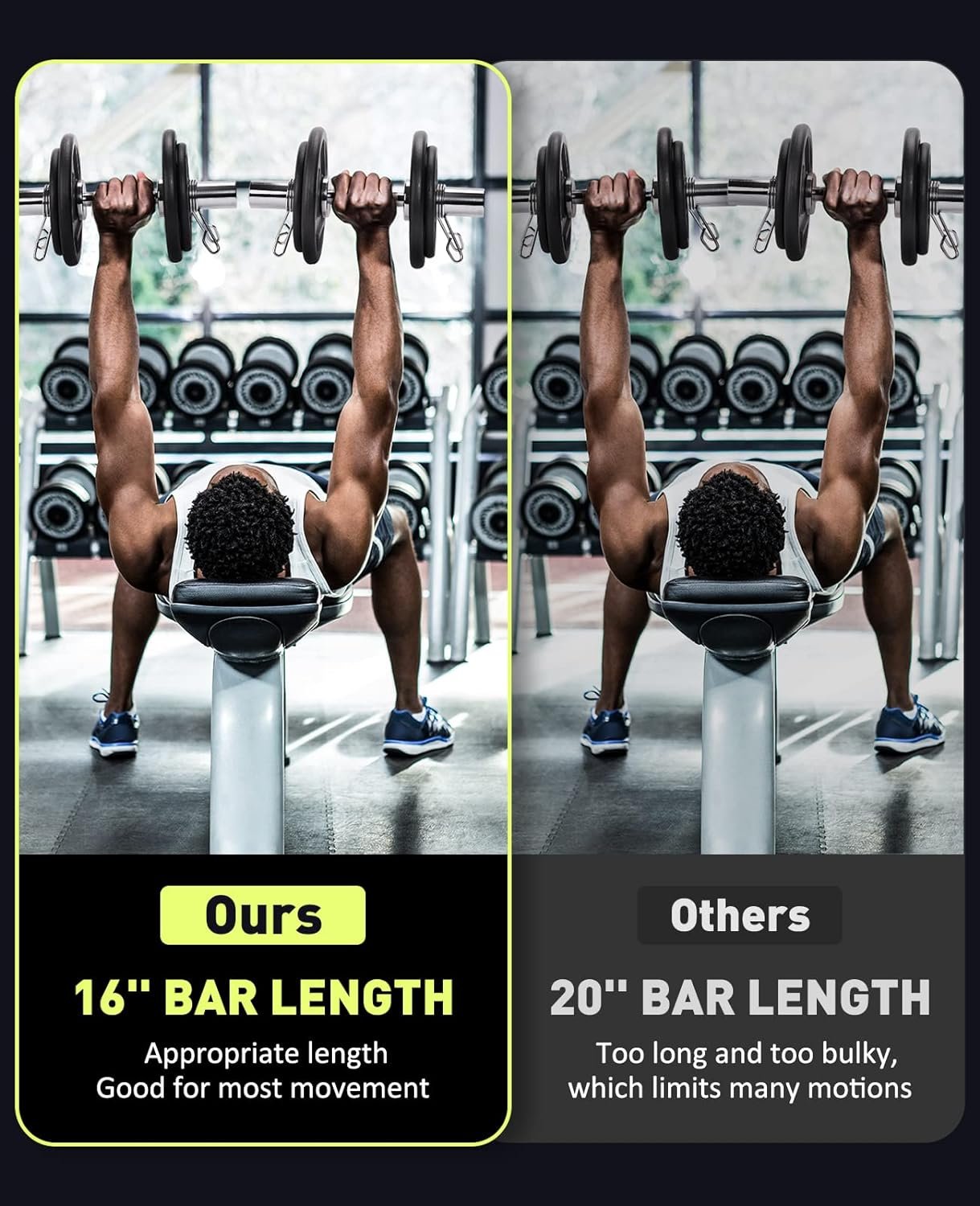 A Great Starter Set: This set includes 2 olympic dumbbell bars and 2 spring collars. The bar is 16″ in length with a 25mm handgrip diameter. Each bar weighs 8.3 LB unloaded, but reaches the weight of 8.3 LB when combined with 2 pair of spring collars