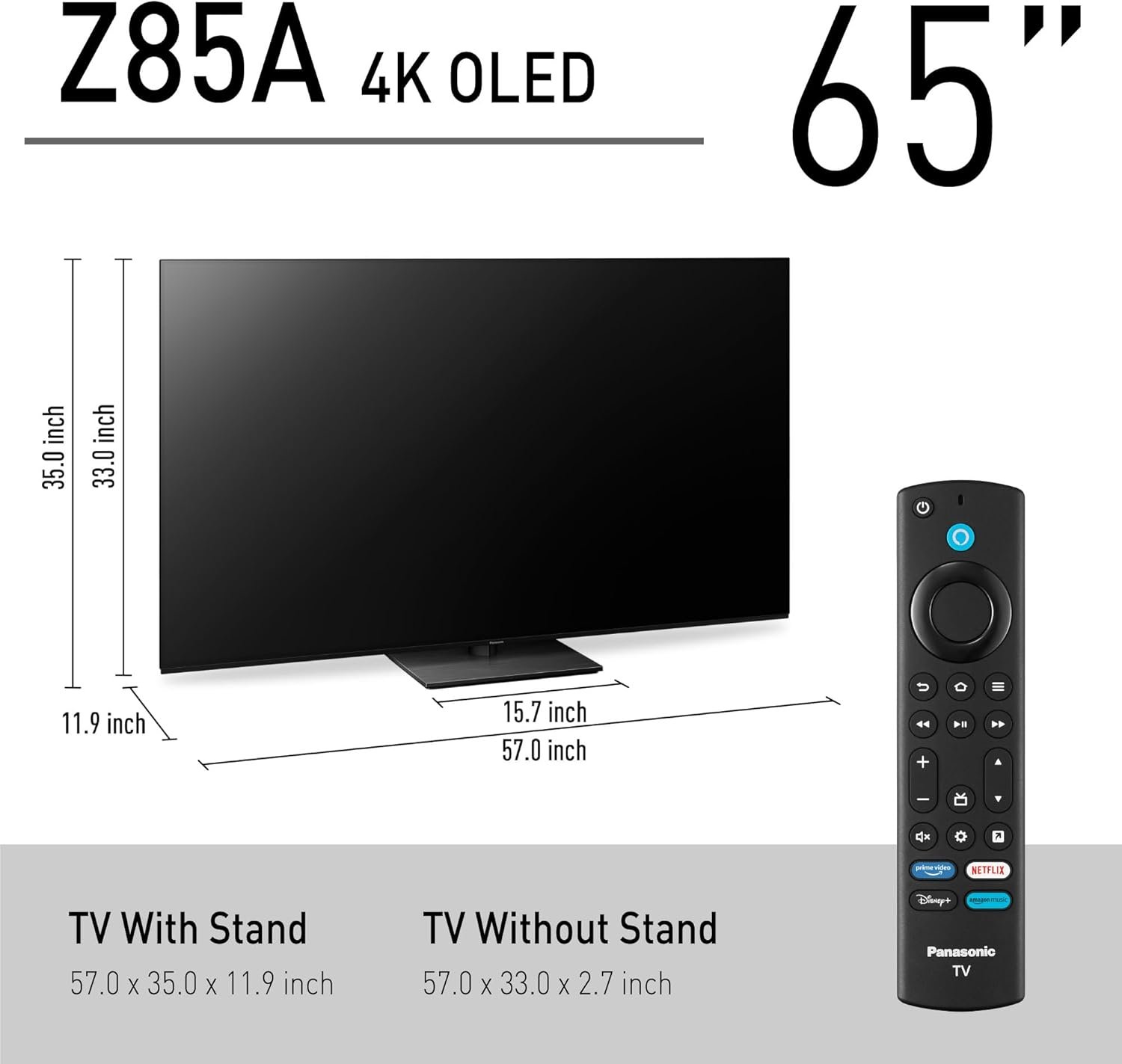 The Z85A is Panasonic’s core 4K Ultra HD OLED smart TV. The core OLED panel module delivers next-level cinematic picture performance. HCX Pro AI Processor MKII brings precise color accuracy, contrast, and clarity as filmmakers intended. Panasonic TVs support all HDR formats, such as HDR10, HDR10 Plus Adaptive, Dolby Vision IQ including Precision Detail, and HLG. Auto AI feature and the intelligent sensing optimize picture based on the type of content being viewed and the ambient light in a room including color temperature. Theater Surround Pro delivers impressive soundscapes, powerful bass with a built-in subwoofer, and crystal-clear dialogues. Together with Dolby Atmos, sound effects are precisely placed in virtual space, delivering immersive 3D surround sound. Game Mode Extreme supports the latest gaming features like HDMI2.1, 120Hz refresh rate, VRR, HFR, AMD FreeSync Premium, NVIDIA G-SYNC. Panasonic also integrates its unique gaming features such as dedicated True Game Viewing Mode, Game Sound Modes for RPG (Role-Playing Games) and FPS (First-Person Shooter), and Game Control Board which provides a game settings dashboard allowing fast access to all settings. All Panasonic TVs are Fire TV built in, integrating streaming and live TV channels, apps, and tailored recommendations on one main home screen. Users can create up to six user profiles. They include the Voice Remote with Alexa (Press and ask Alexa) to easily launch apps, play music, search for titles, and more, using your voice. Compatible with Alexa-enabled devices such as Ring Doorbells, they feature a smart home dashboard. The Fire TV Ambient Experience turns TVs into a beautiful, always-on smart display rotating through beautiful art, personal photos, and glanceable information that keep you updated throughout the day through customizable Alexa widgets.