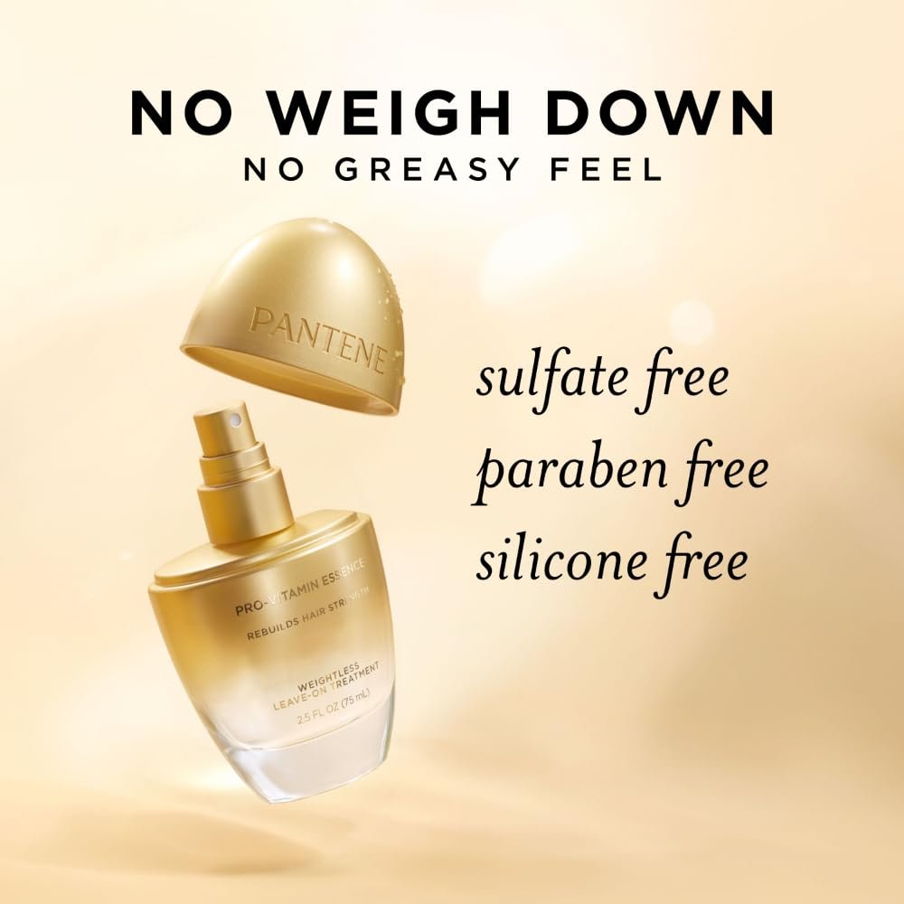 PANTENE Pro-Vitamin Essence contains concentrated Pro-Vitamin B5 to repair damage at the deepest part of hair and build new bonds. Helps rebuild to 95% of hair’s strength*. Lightweight essence absorbs into hair’s core to relink hairs protein structure without weighing hair down. Use daily by misting generously on wet or dry hair, from root to tip. Get visible Pro-Vitamin repair in just 10 days!