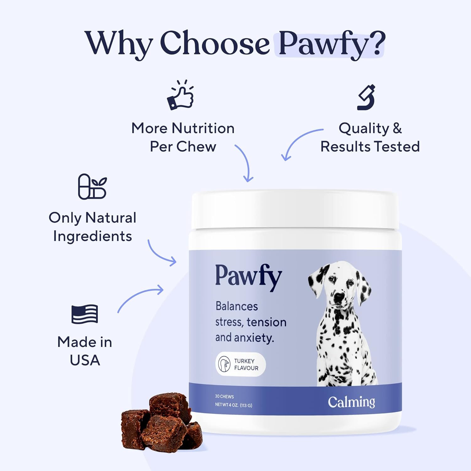 Fast-Acting Anxiety Relief: Discover rapid dog anxiety relief with Pawfy’s unique blend of natural ingredients, designed to combat separation anxiety and fear. Our calming treats for dogs support your furry friend’s emotional health, encouraging a happier, more balanced demeanor without harsh chemicals, ensuring safety and efficacy.