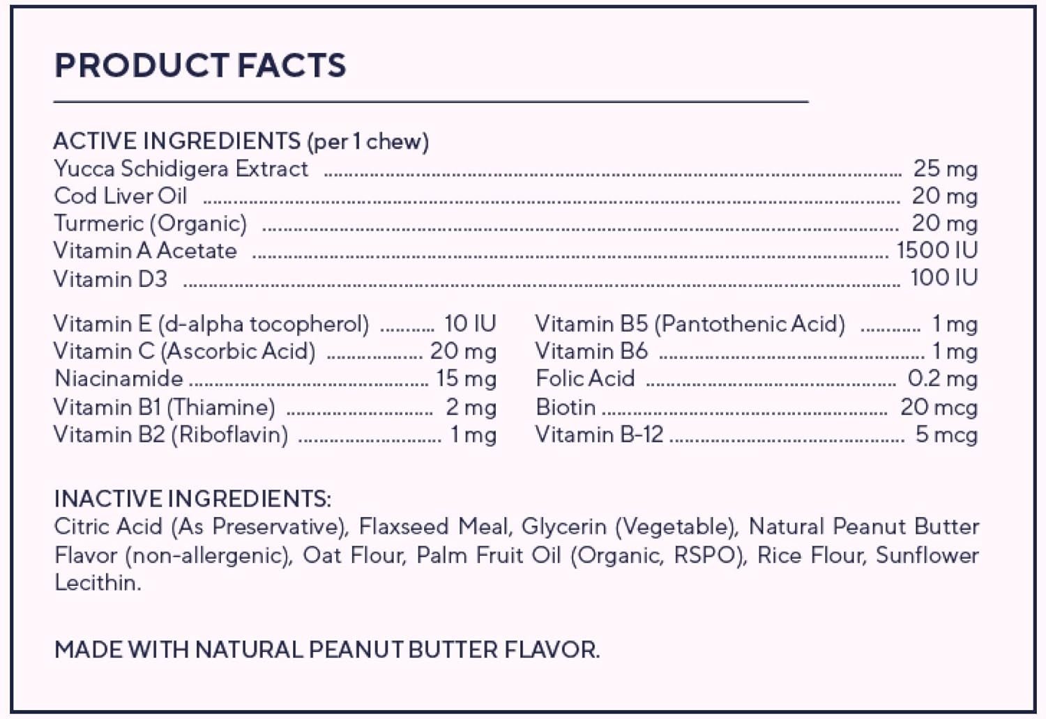 Multivitamin Ingredients: Cod Liver Oil, Vitamin A Acetate: Vitamin D3, Organic Yurmeric: YuccaMultivitamin Ingredients: Cod Liver Oil, Vitamin A Acetate: Vitamin D3, Organic Yurmeric: Yucca