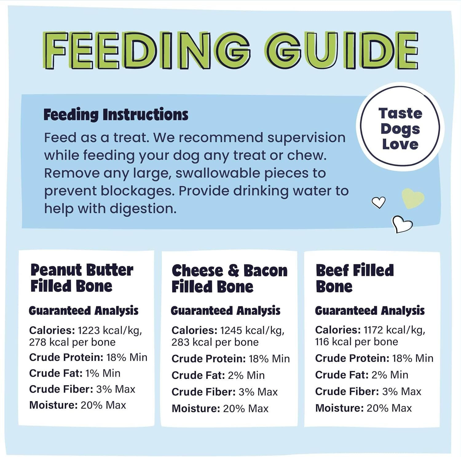 This Variety Pack includes 1 Peanut Butter, 1 Cheese & Bacon, and 1 Beef Filled Bone. Our filled bones for dogs are Made in the USA to ensure the healthiest and safest possible dog chews. Our Midwest processing plant adheres to the strictest of quality assurance standards and sources free range, grass fed cattle. Additionally, our facilities are audited, inspected, and approved by outside 3rd party inspectors.