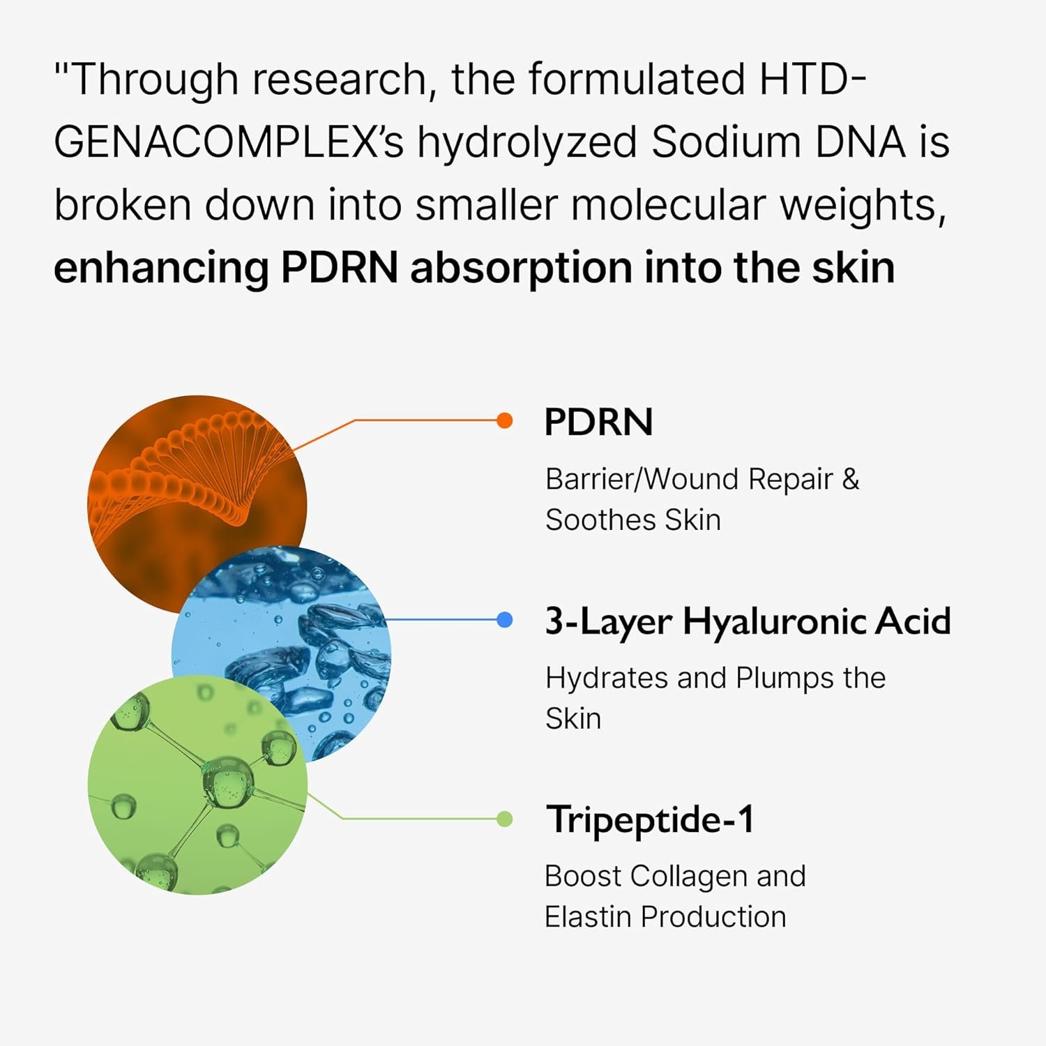 🧪HTD-GENACOMPLEX TM: A unique patented complex created with salmon DNA, 3 Layers of Hyaluronic Acid, and Tripetide-1. This combination dramatically improves skin elasticity, plumpness, and brightness.