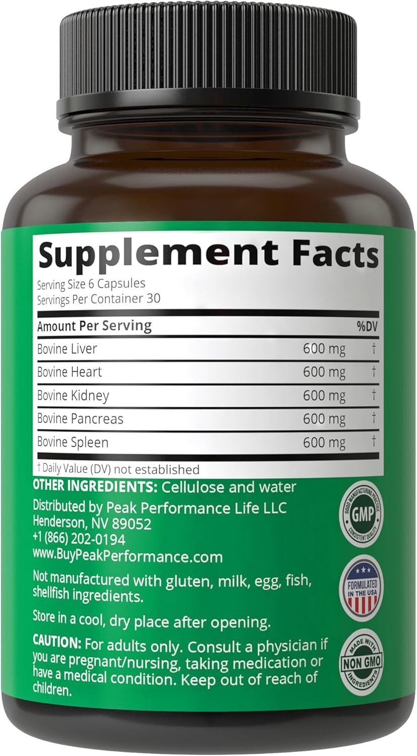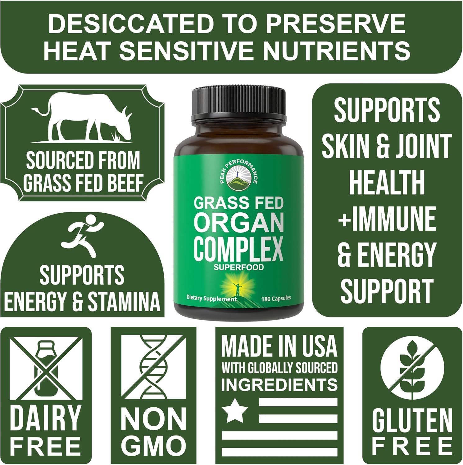High Potency & Maximum Absorption: Peak Performance Grass Fed Organ Complex is a nutrient dense superfood sourced from a wide array of organs such as liver, heart, kidney, pancreas and spleen. Great for Immune and Adrenal Support, Skin, Joints, and Energy Support.*