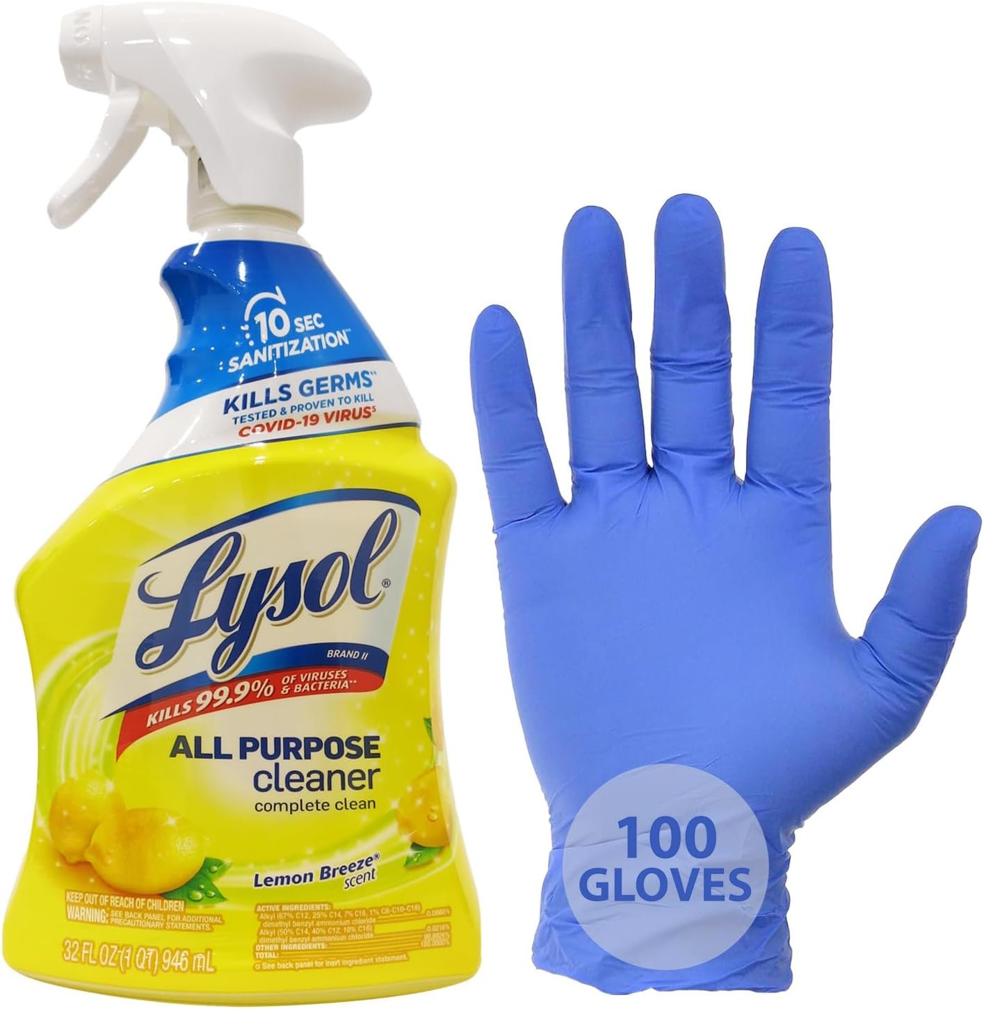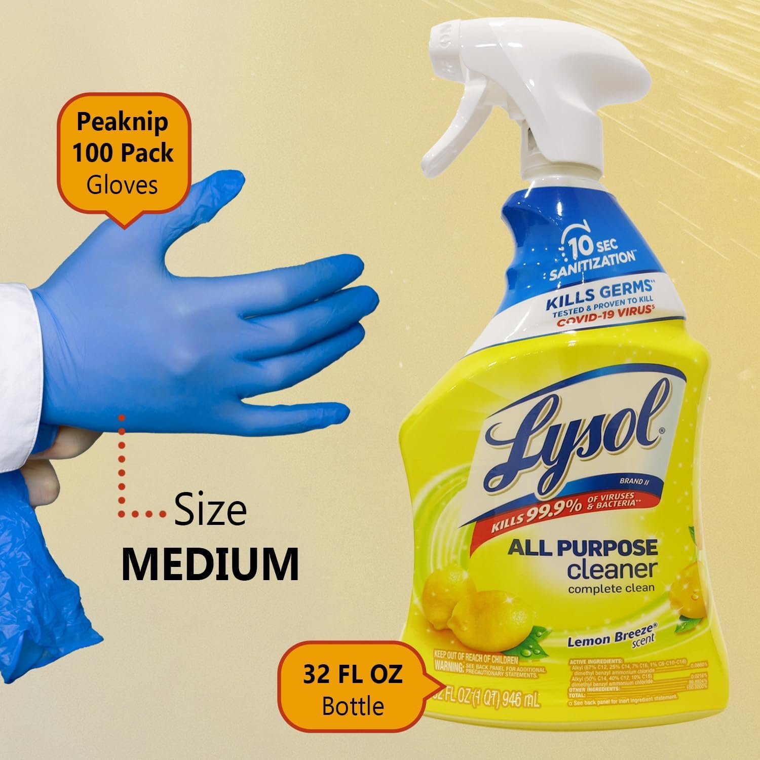 Peaknip Lysoil All-Purpose Cleaner – Sanitizing and Disinfecting Spray To Clean and Deodorize – Lemon Breeze Scent 32 Fl oz. Bundled Together 100 Disposable Gloves
