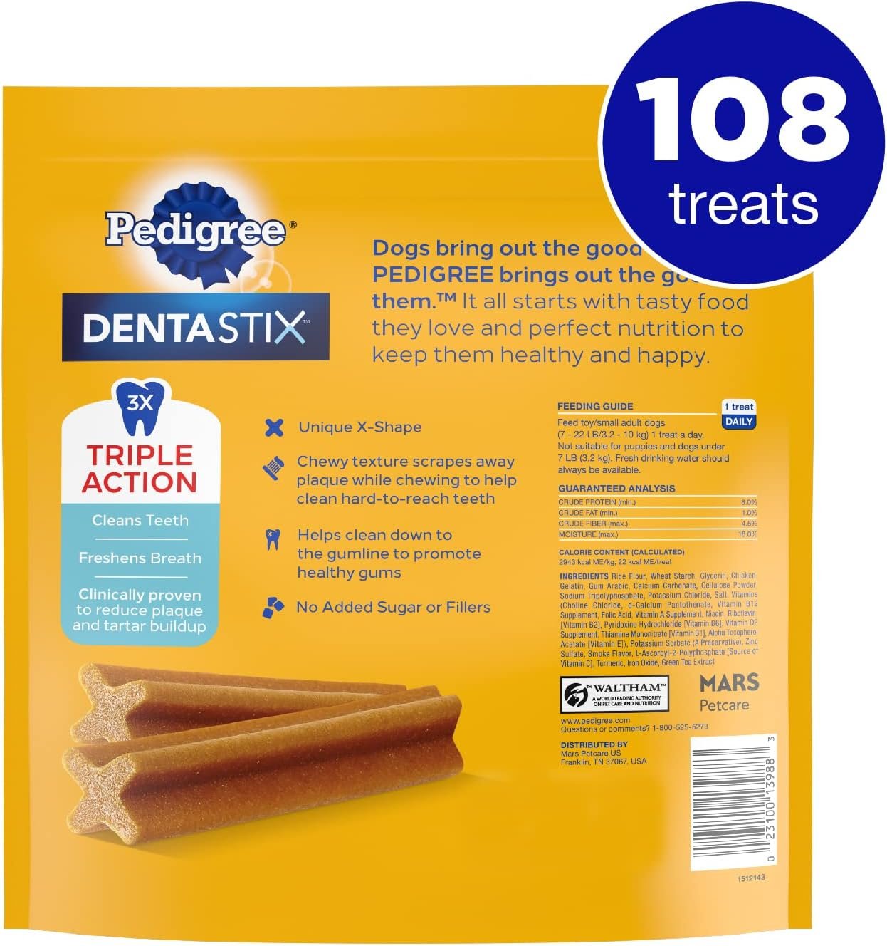 Contains one (1) 1.68 lb. 108-count pack of PEDIGREE DENTASTIX Original Flavor Treats for Toy/Small Dogs
