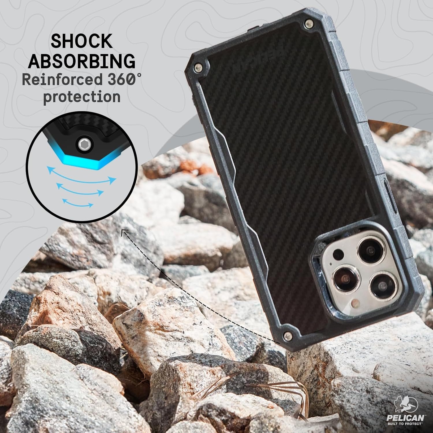 Shield Kevlar Series Pelican Phone Case: Gear up your phone with the Pelican iPhone 15 Pro Max MagSafe case, engineered with 4 layers of hard polymers & rubber, all backed by bulletproof Aramid Fibers. This MagSafe iPhone 15 Pro Max case pairs a professional look with top-tier functionality—multiple latches, tactile sides, & a holster with a belt clip & kickstand for on-the-go use. Feel the solid grip of the Pelican iPhone 15 Pro Max case for Apple, always adventure-ready!