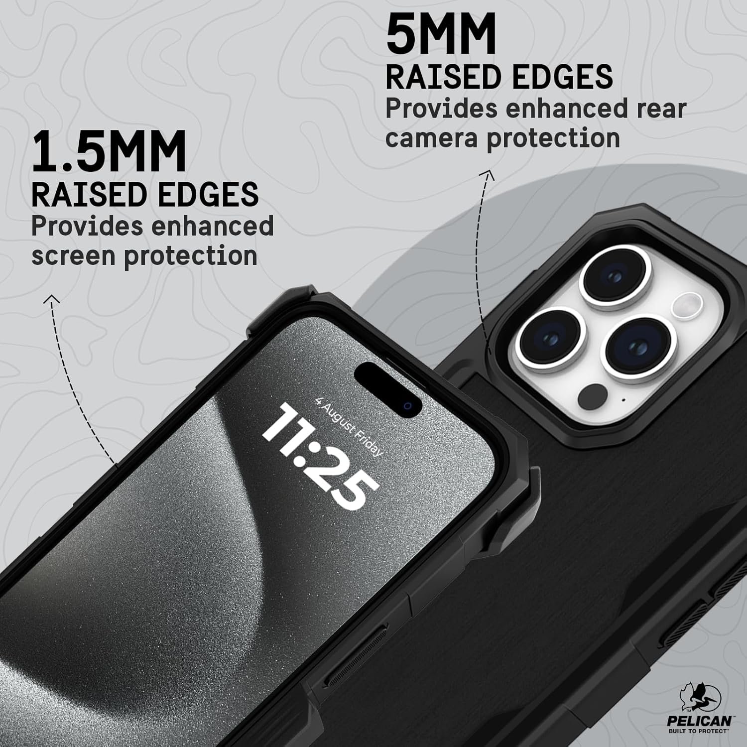 21FT Military Grade Drop Endurance: Upgrade your iPhone’s defense with our iPhone 15 Pro Max case heavy duty Pelican Shield, designed for 21FT shock absorption per MIL-STD 810G! Crafted from premium impact polymer, this iPhone case 15 Pro Max combines rugged durability & textured design, delivering reinforced 360° defense. Experience the benefit of raised corners in the iPhone 15 Pro Max Apple case: 5mm for the rear camera & 1.5mm for the screen, ensuring your device is prepared for anything.
