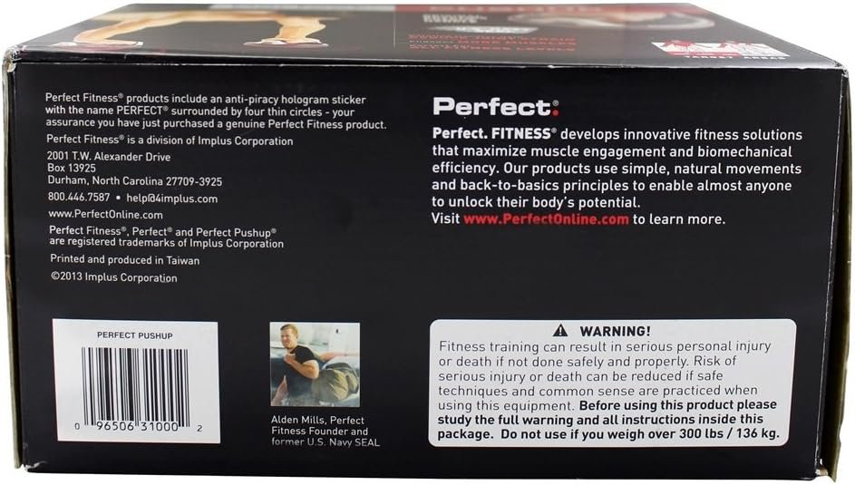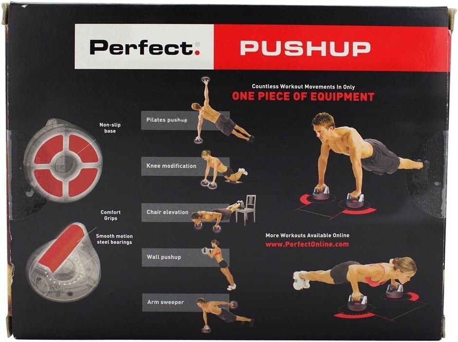The Perfect Fitness Perfect Pushup Rotating Push Up Handles reduce strain on joints, and engage more muscles for a truly perfect pushup. The original, patented design features a ball bearing system that provides smooth, full rotation for natural alignment of the arms and wrists. Comfortable rubber grips and non-slip base ensure stability during high rep, multiple set upper body workouts. Invented by a US Navy SEAL to optimize the basic push up, the Perfect Fitness Perfect Pushup reduces pressure on the hands and wrists, and effectively activates muscles through its ergonomic design, increasing strength and definition in arms, shoulders, chest, back, and core. Appropriate for all fitness levels, from beginner to expert. Includes two rotating handles.