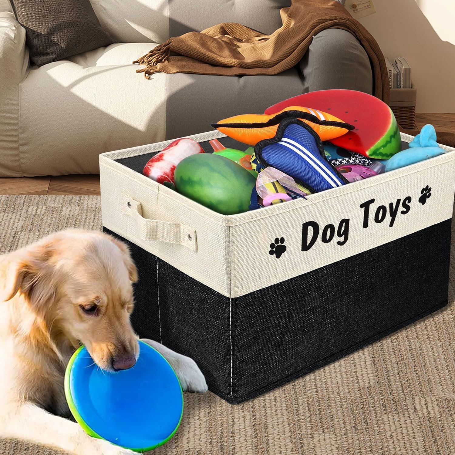 CUTE UPGRADED DESIGNS – This cute design dog toy box stands upright,convenient for put in or get toys out,it`s folded when needed. With 2 handles on each side,the dog toys basket can be moved easily
