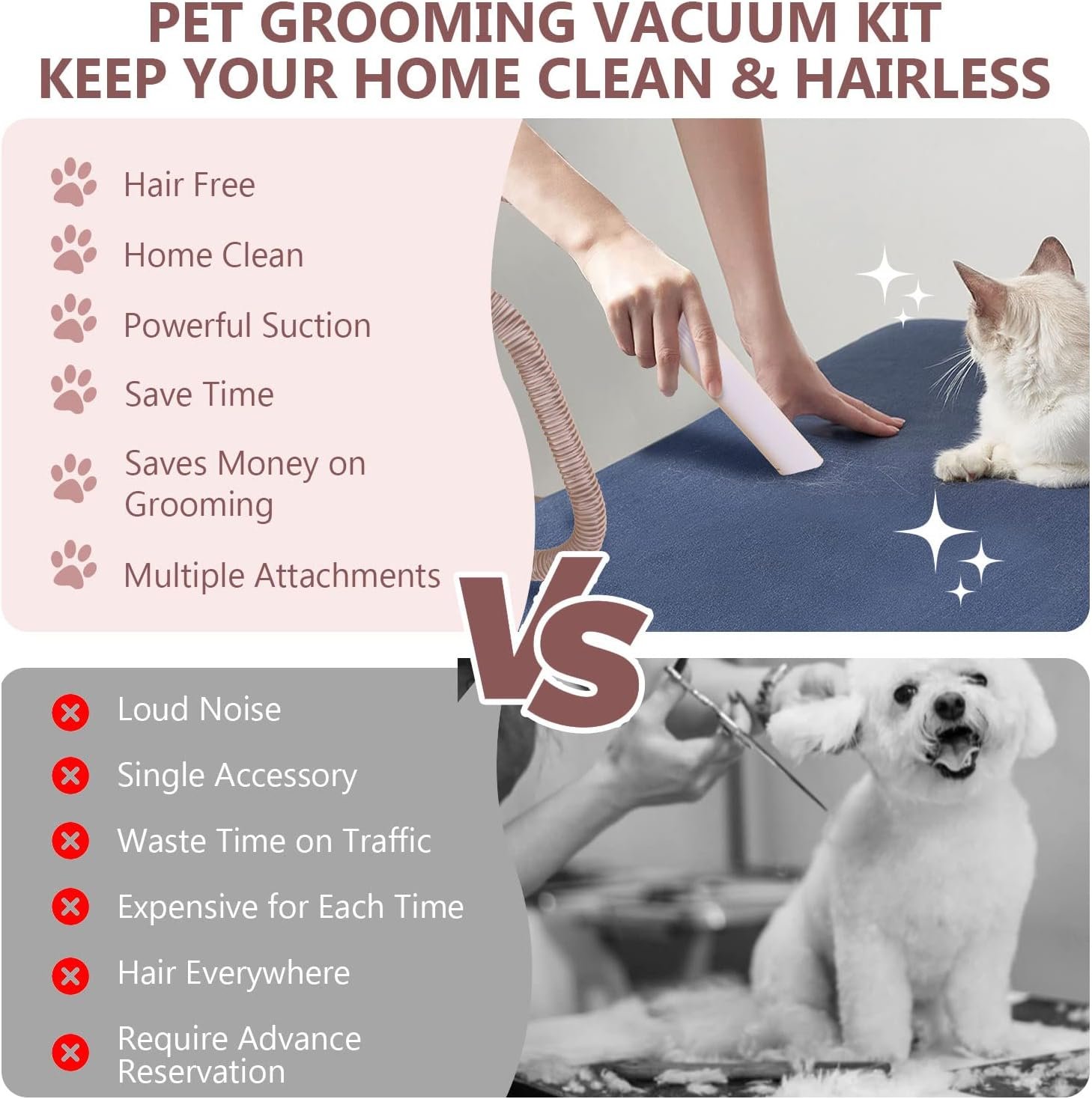 [Multifunctional Dog Grooming Kit]: This dog grooming vacuum attachment features 7 professional tools, including shedding tool, slicker brush, hair remover, nail clipper, electric clipper with 4 clipping combs, crevice tool, and clean brush, for comprehensive pet hair care and hassle-free cleaning of clothes, beds, sofas, and corners.