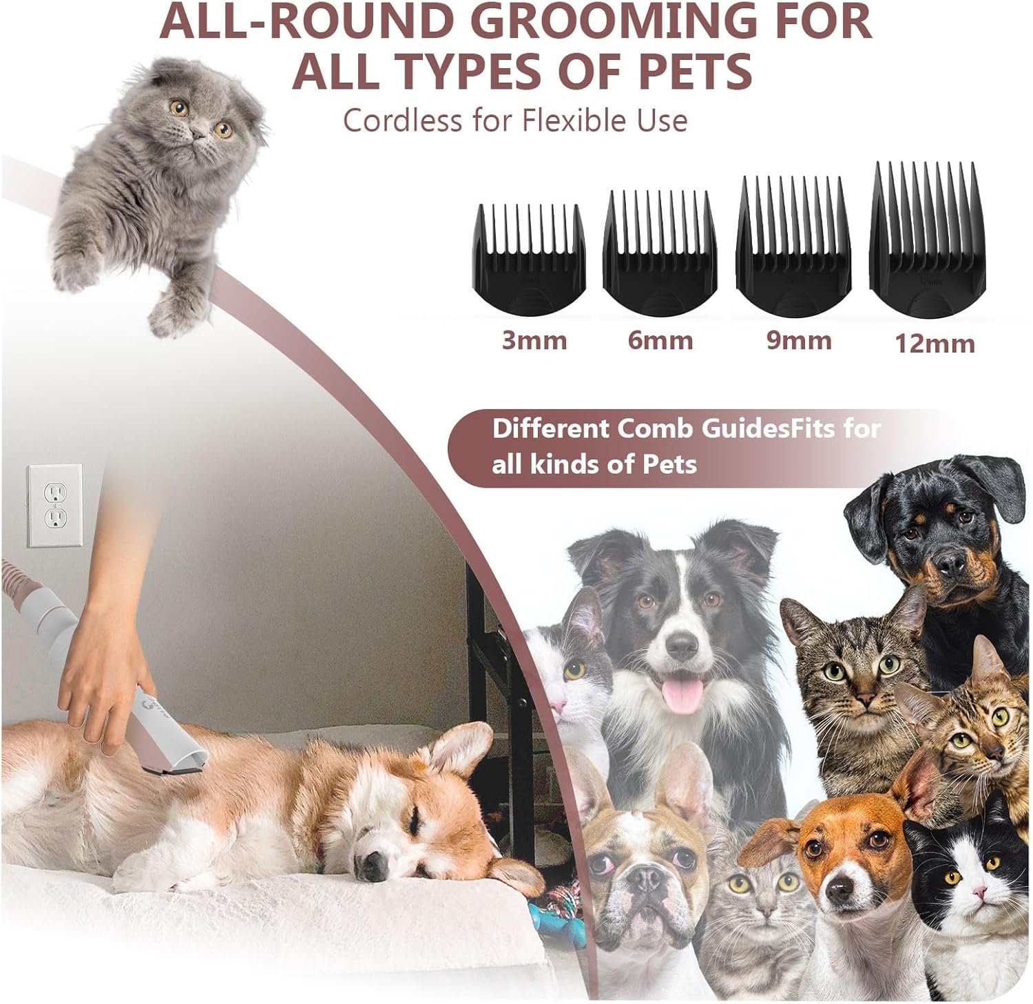 [Versatile Dog Clippers]: Detachable and rechargeable pet grooming clipper can be used independently or with the vacuum. Comes with limiting guard combs (3mm, 6mm, 9mm, 12mm) for customizable pet hair grooming, even for beginners.