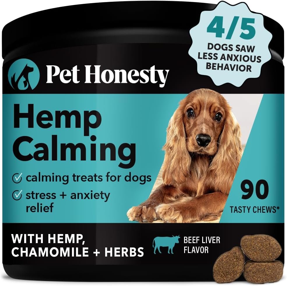 Pet Honesty Hemp Calming Chews for Dogs – Dog Anxiety Relief, Dog Calming Treats with Hemp + Valerian Root, Melatonin for Dogs – Helps Aid with Thunder, Fireworks, Chewing & Barking (Beef Liver 90 ct)