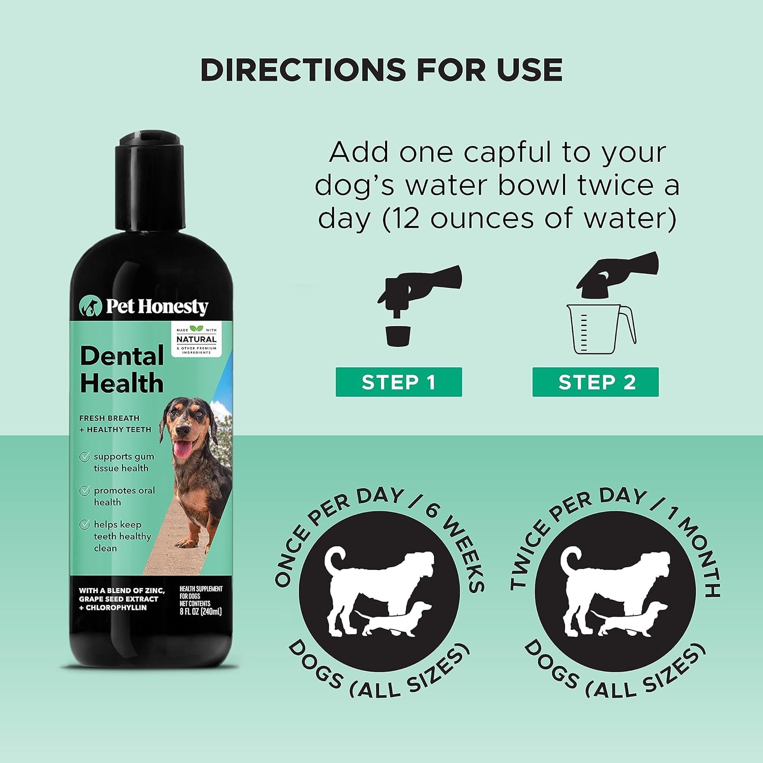 Natural Ingredients + No Chemicals or Toxins: PetHonesty’S Oral Hygiene dental water for dogs was formulated with natural ingredients as an alternative to other dental waters on the market that are made with harmful chemical ingredients like CPC, Sodium Benzoate and Chlorine which have been shown to be toxic to dogs. You’ll find only safe, natural ingredients in PetHonesty’s Oral Hygiene water.
