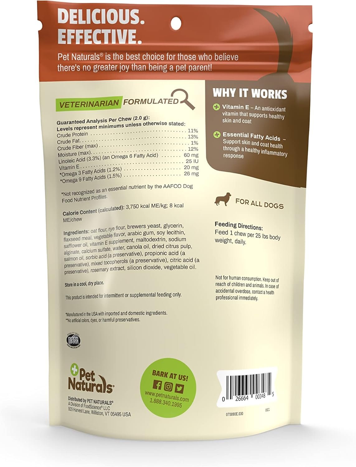 Dry skin is just as uncomfortable for our pets as it is for us.pet Naturals of Vermont skin + coat Care for dogs helps support moisture and elasticity in the skin as well as the shine and texture of your pet’s coat. This veterinarian designed formula includes salmon Oil and vitamin E for better skin and coat health. Flax oil supports a healthy digestive system for total health from the inside out.