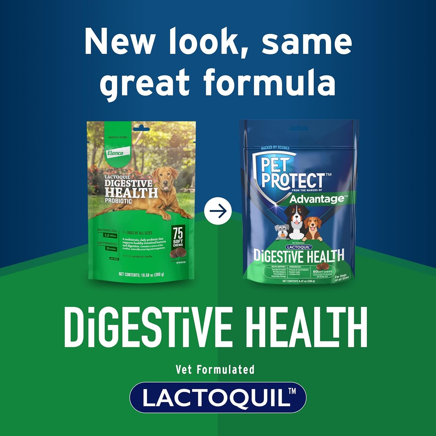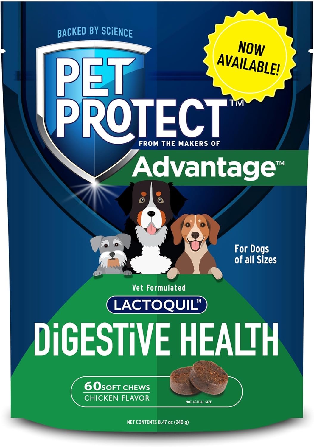 From the makers of Advantage, Pet Protect Digestive Health supplement for dogs features Lactoquil, a formula developed by veterinarians that supports gut health