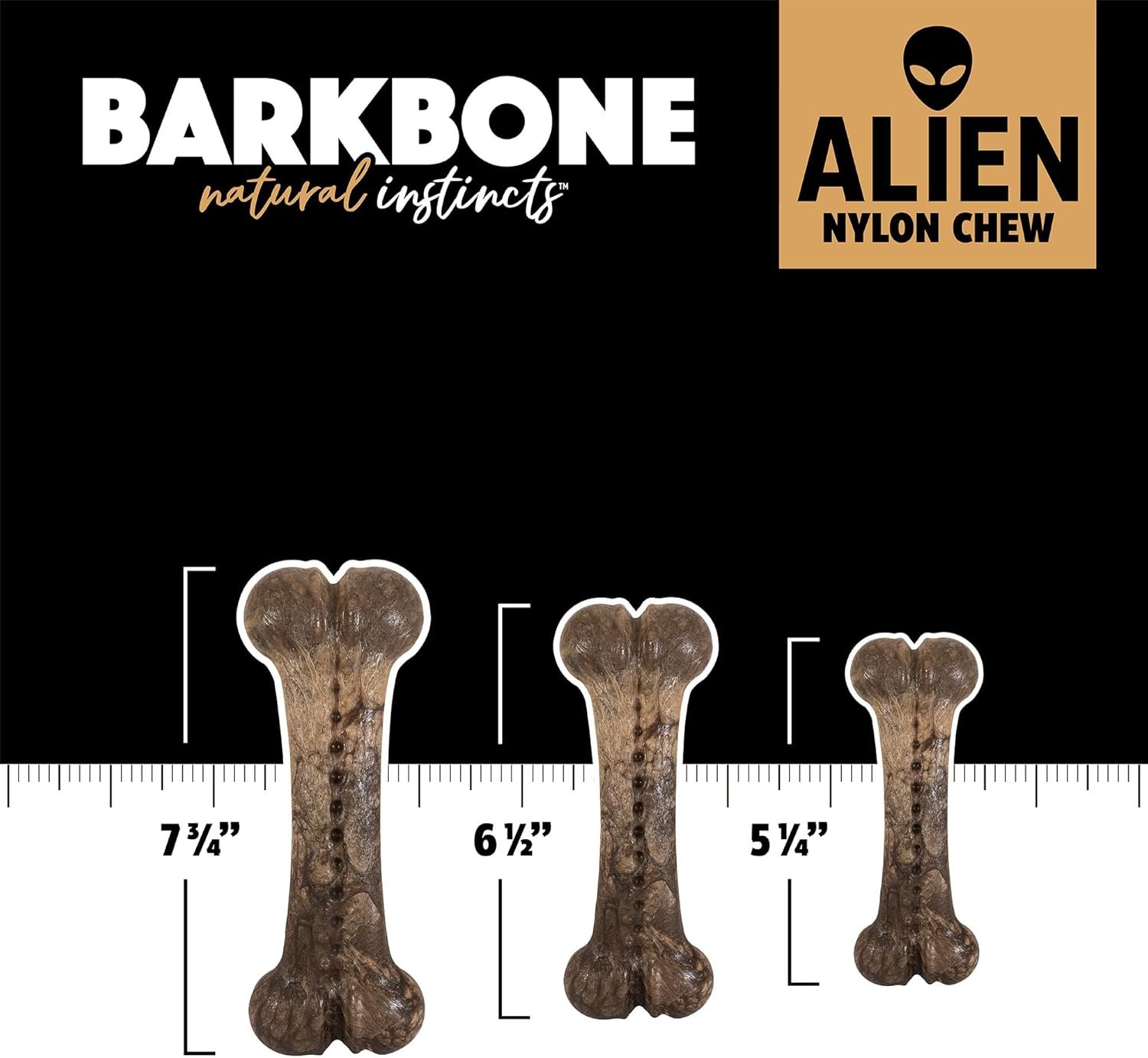 BarkBone Nylon Alien Dog Bones hold that classic bone shape with an out-of-this-world twist. The bone has a curved shape for easier paw grip but also features a textured ridge and flavor cells for a variety of mouth pleasing chew options..