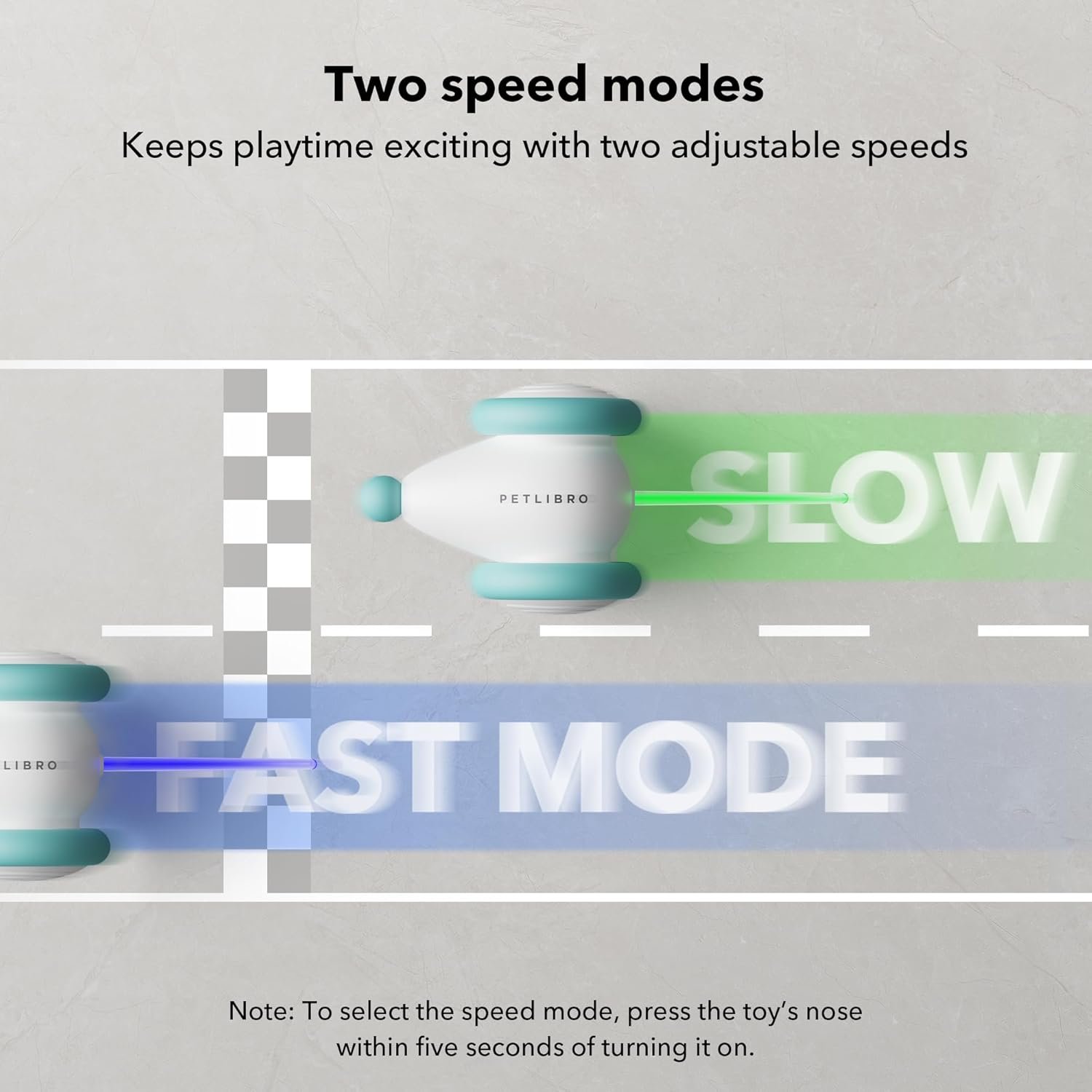 Adjustable Speeds: The cat toy offers two speed settings—a green light strip indicates slow mode, while a blue light strip indicates fast mode. You can adjust the speed to cater to the preferences of different cats. Note: To select the speed mode, press the toy’s nose (power button) within five seconds of turning it on.