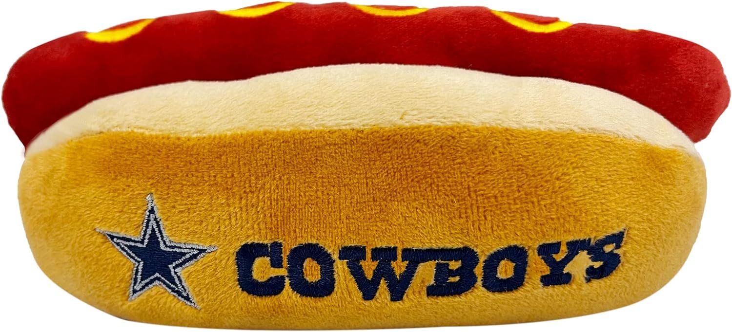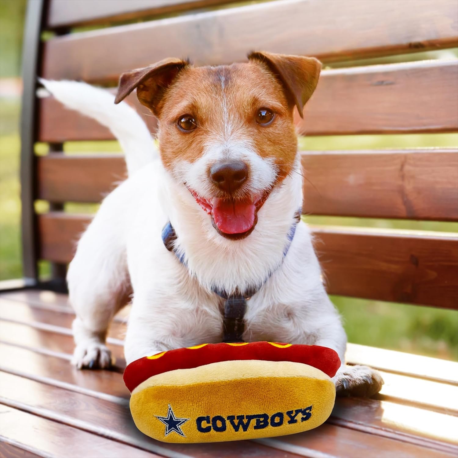 Pets First NFL Dallas Cowboys HOT Dog Plush Dog & CAT Squeak Toy – Cutest HOT-Dog Snack Plush Toy for Dogs & Cats with Inner Squeaker & Beautiful Football Team Name/Logo, 8 x 5 x 3 Inches